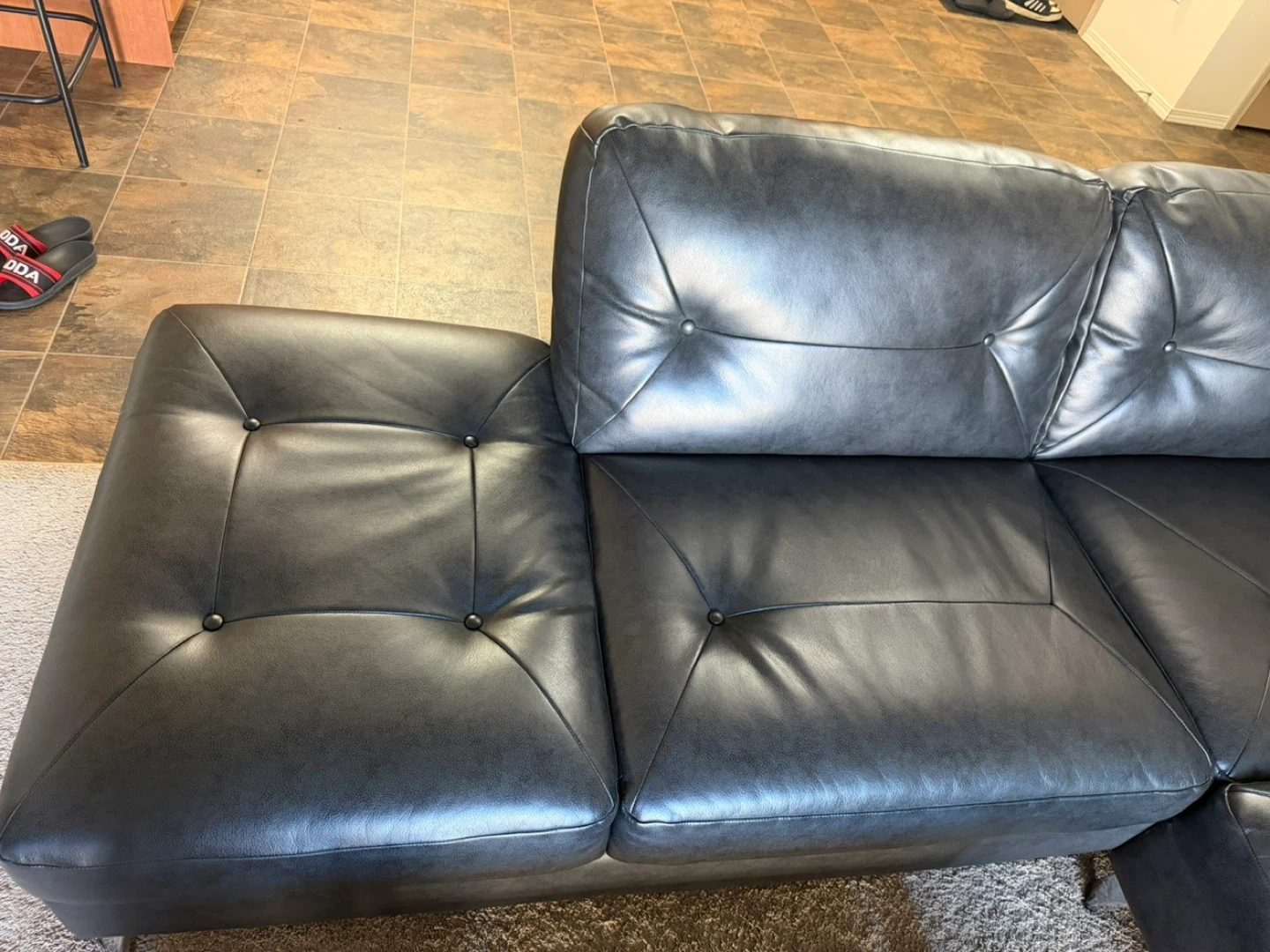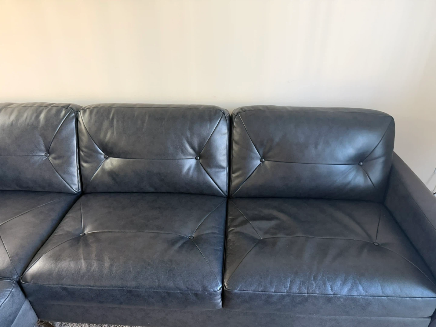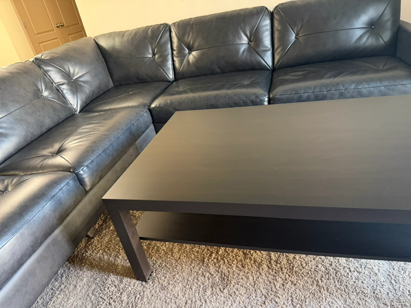 Grey faux leather sectional sofa with tufted cushions. Includes a matching dark grey coffee table. This set is perfect for a living room or den! Some minor wear on the sofa, as seen in photos.