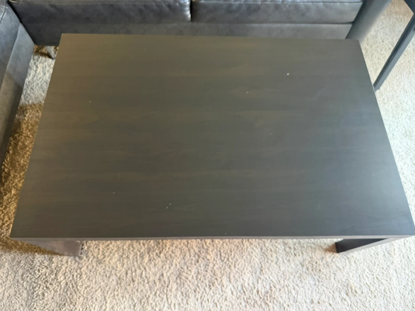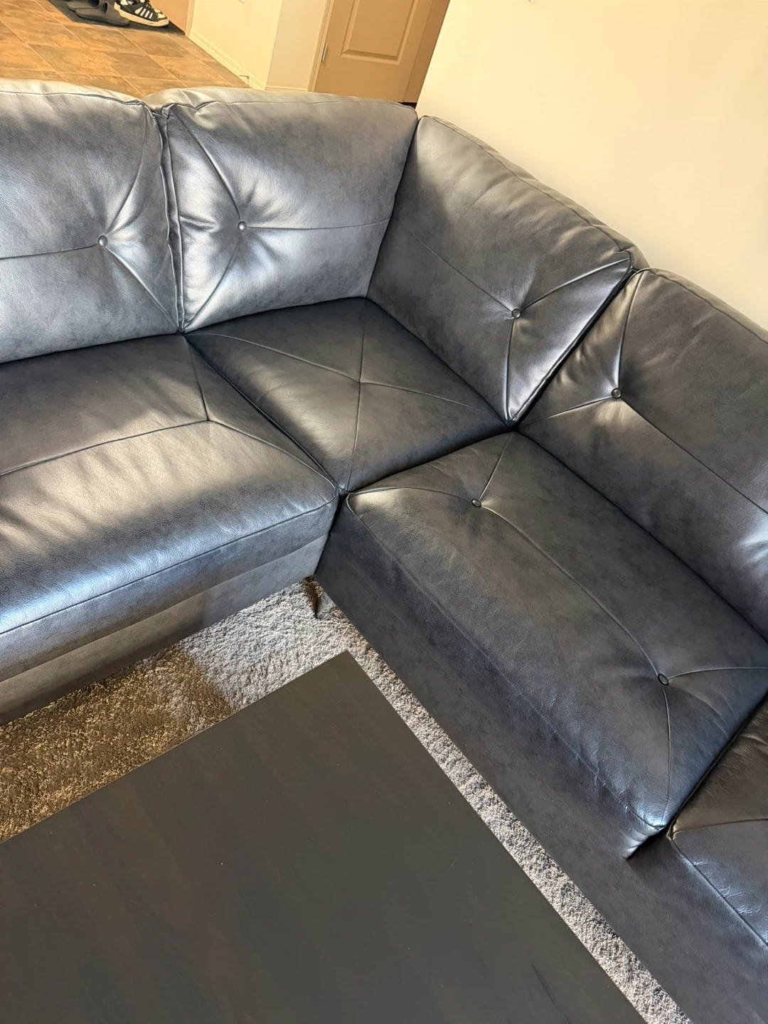 Grey faux leather sectional sofa with tufted cushions. Includes a matching dark grey coffee table. This set is perfect for a living room or den! Some minor wear on the sofa, as seen in photos.