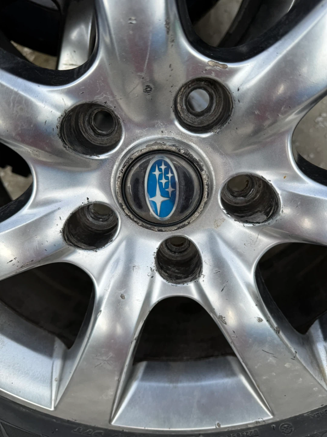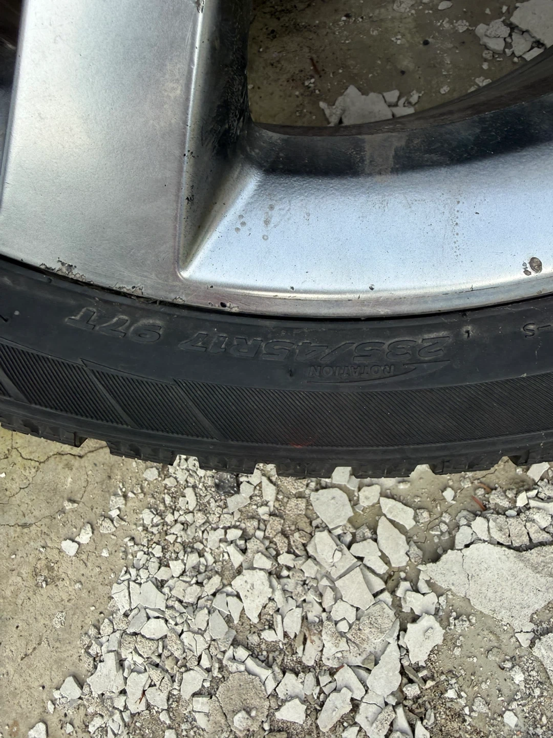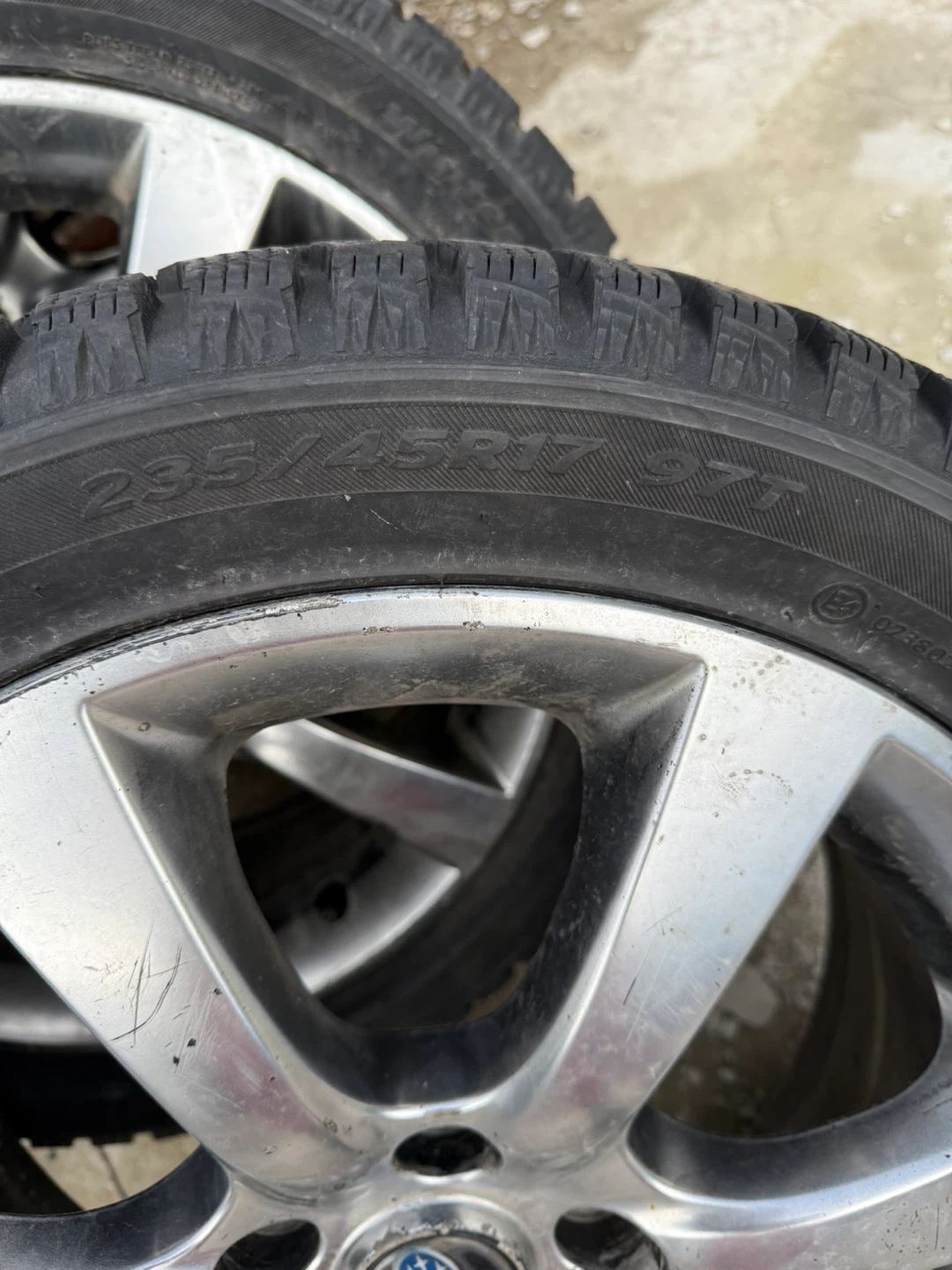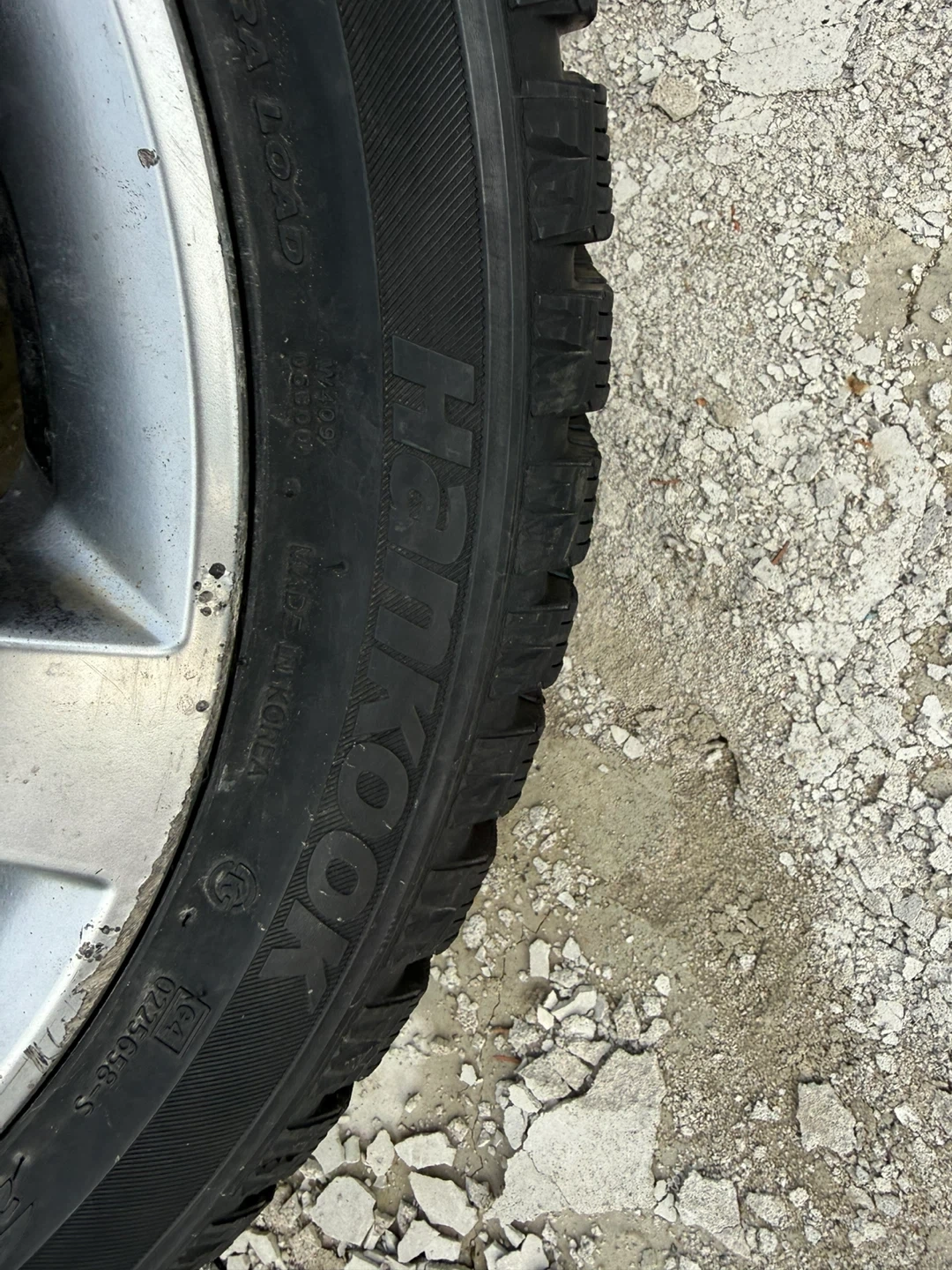 Four Hankook winter tires with aluminum rims. Tire size is 235/45R17. They're ready for winter driving conditions!