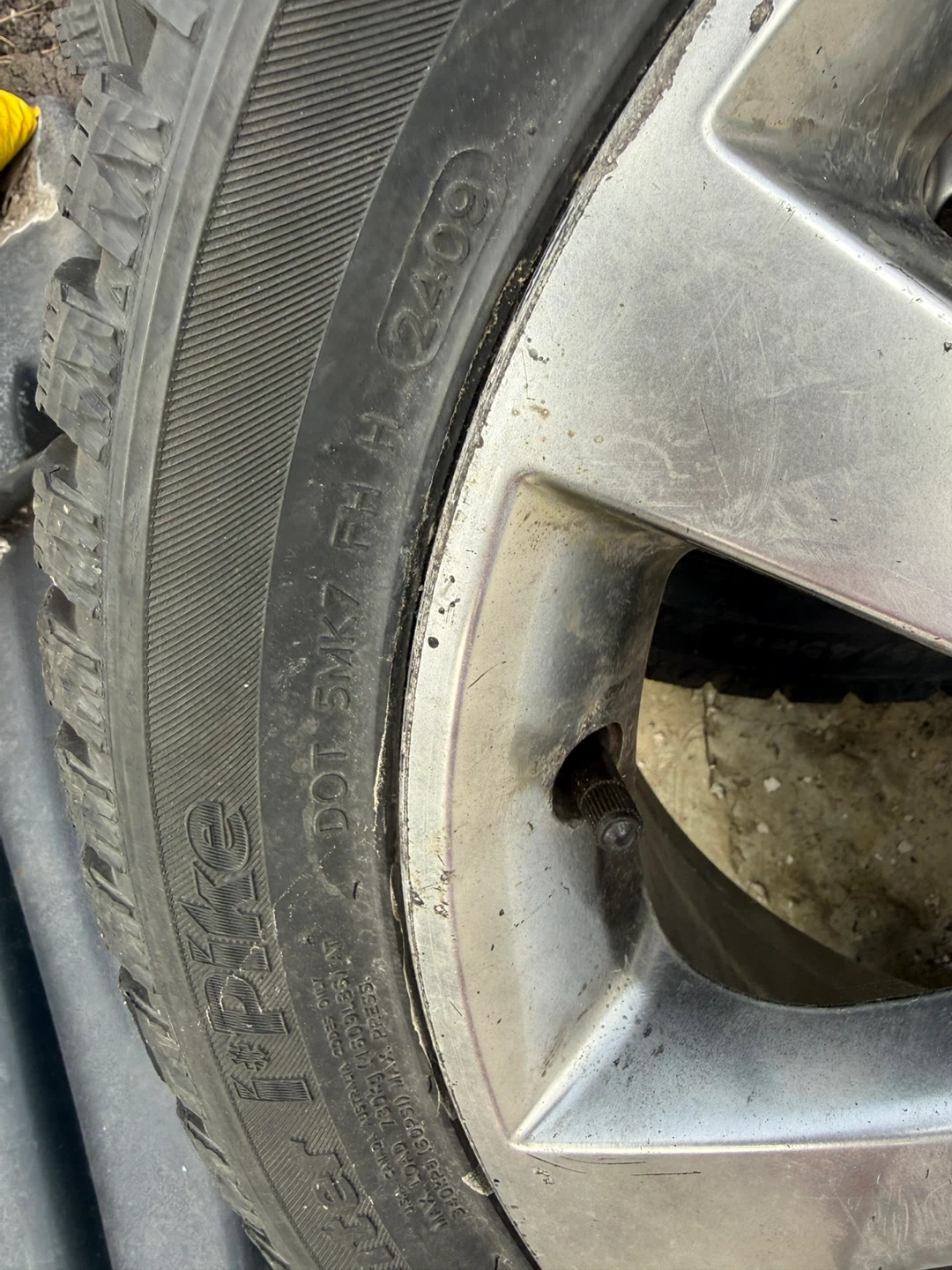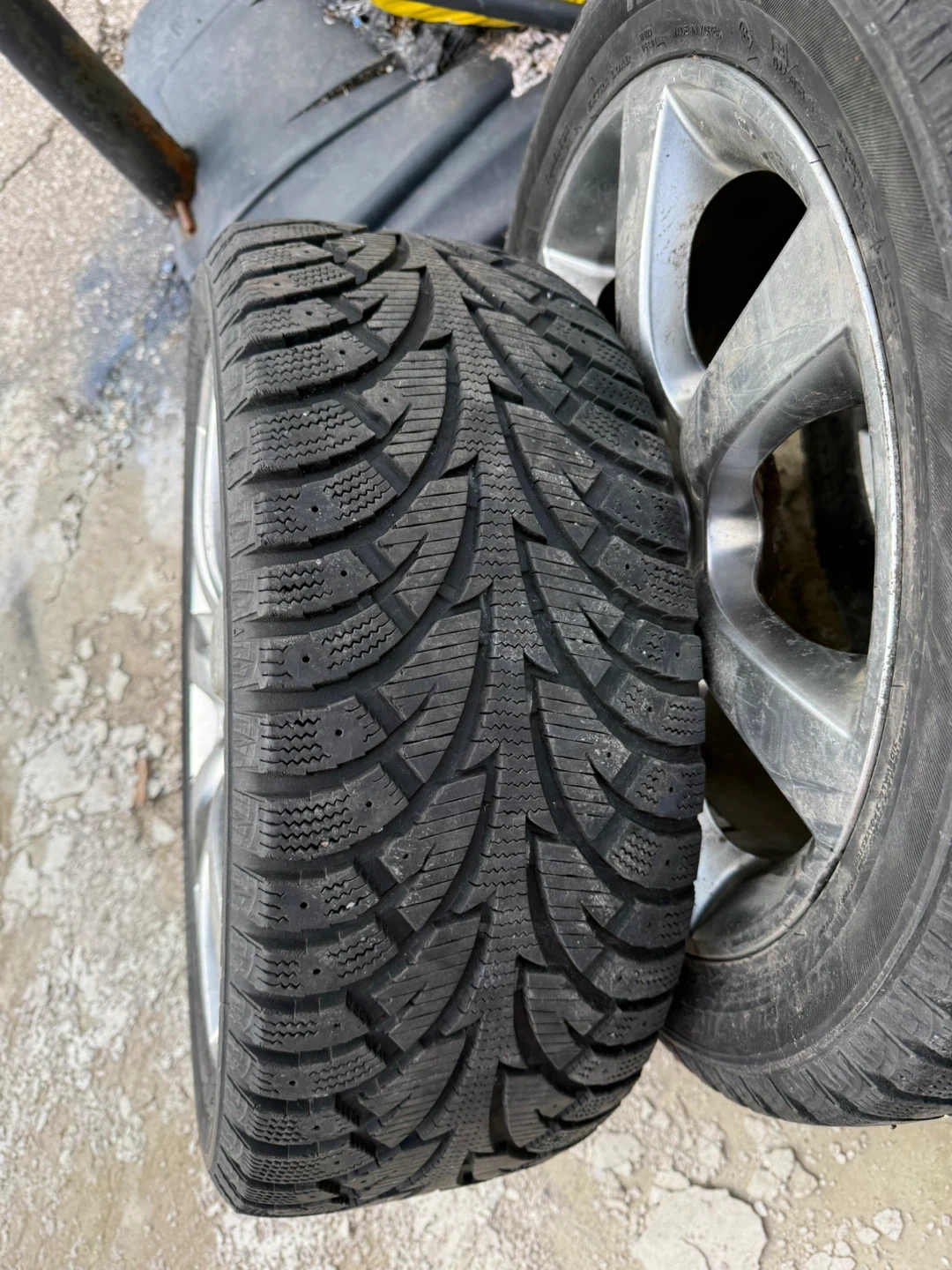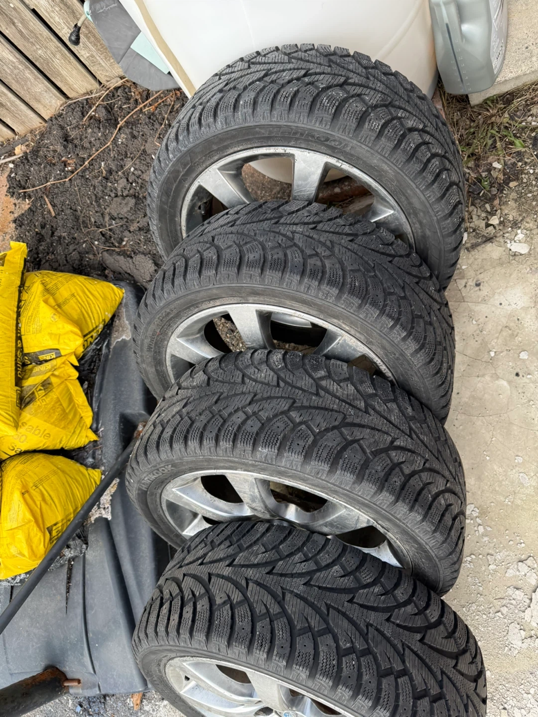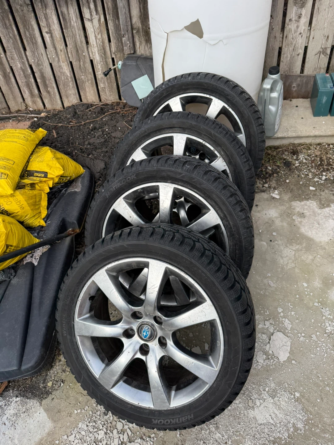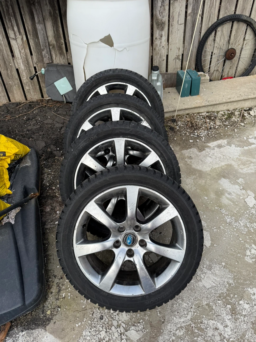 Four Hankook winter tires with aluminum rims. Tire size is 235/45R17. They're ready for winter driving conditions!