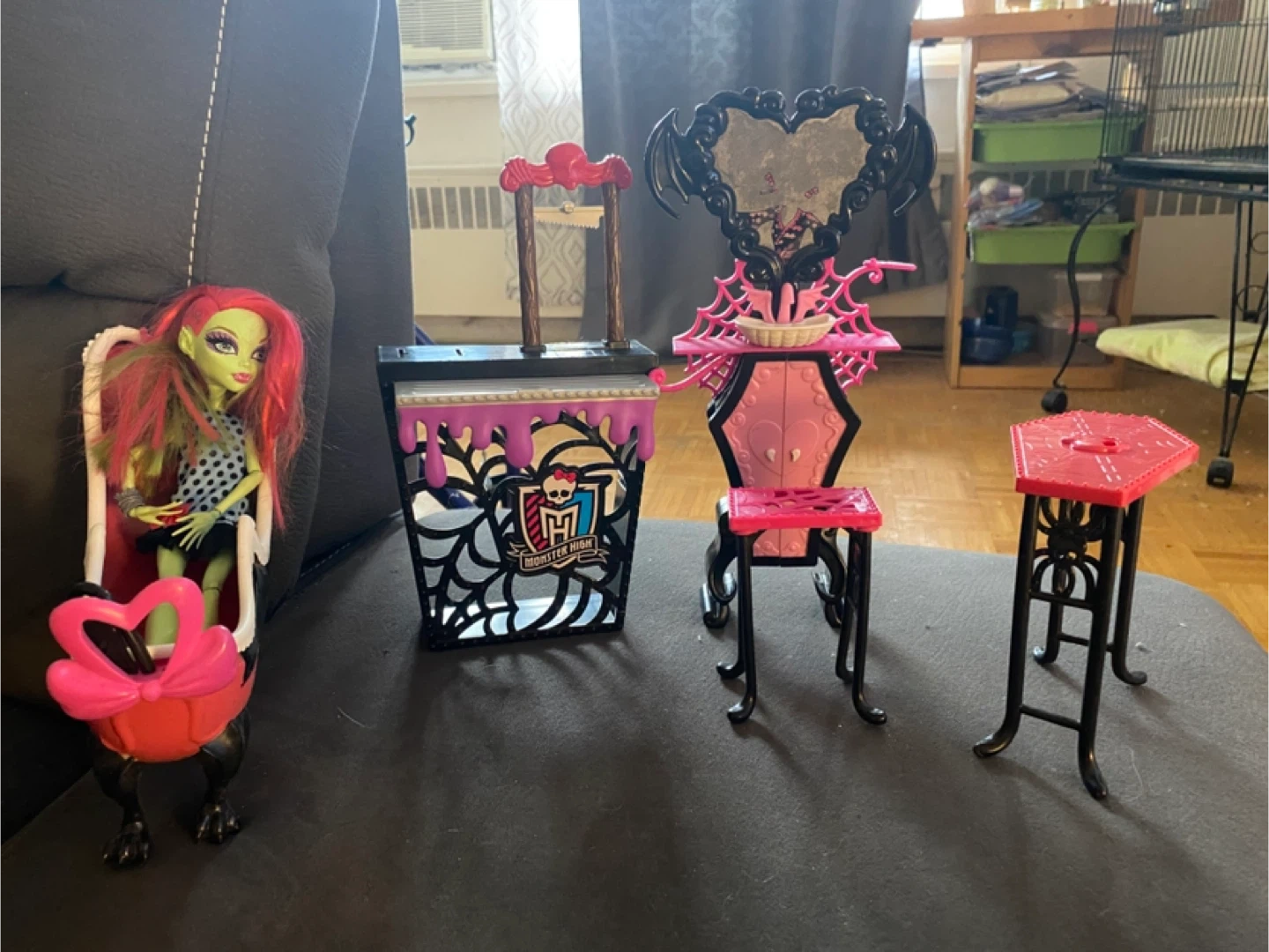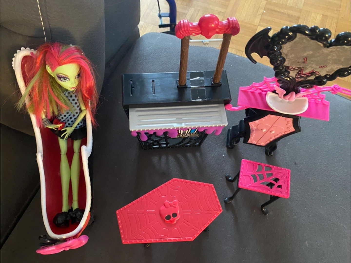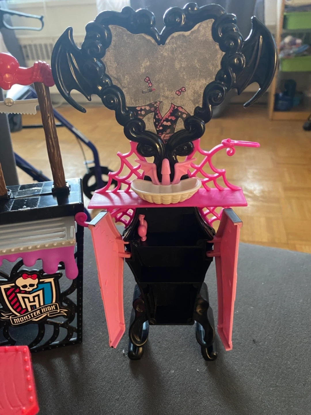 This Monster High doll and vanity set includes the doll, bathtub, a coffin table , a vanity with mirror, and a stool. The vanity has pink accents and a black frame with spiderweb details and vanity door opens. It's a fun set for imaginative play!
