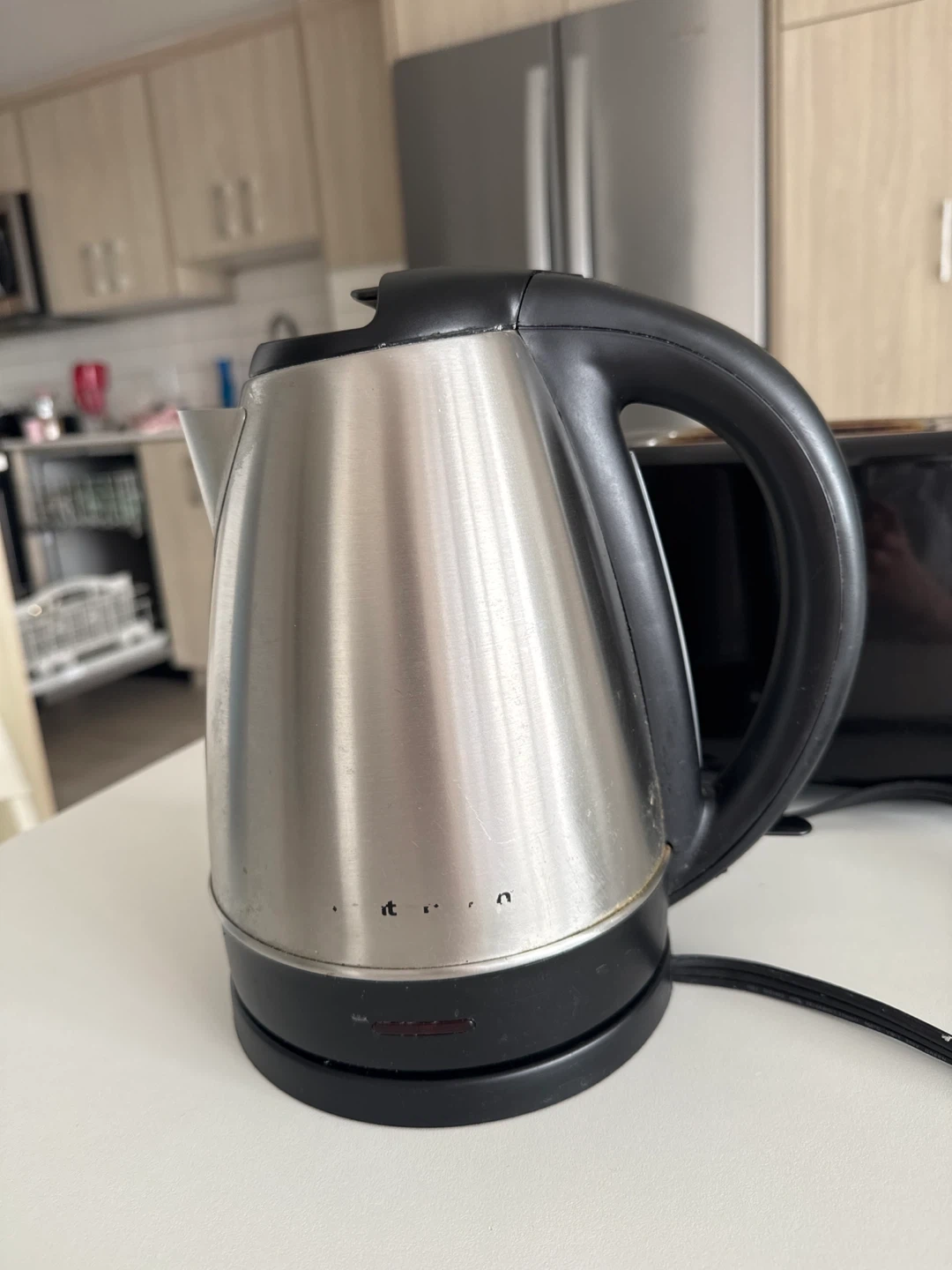 This stainless steel electric kettle has a capacity of 1.7 litres. It features a black handle and base with a power indicator light. Works great for quick hot water needs!