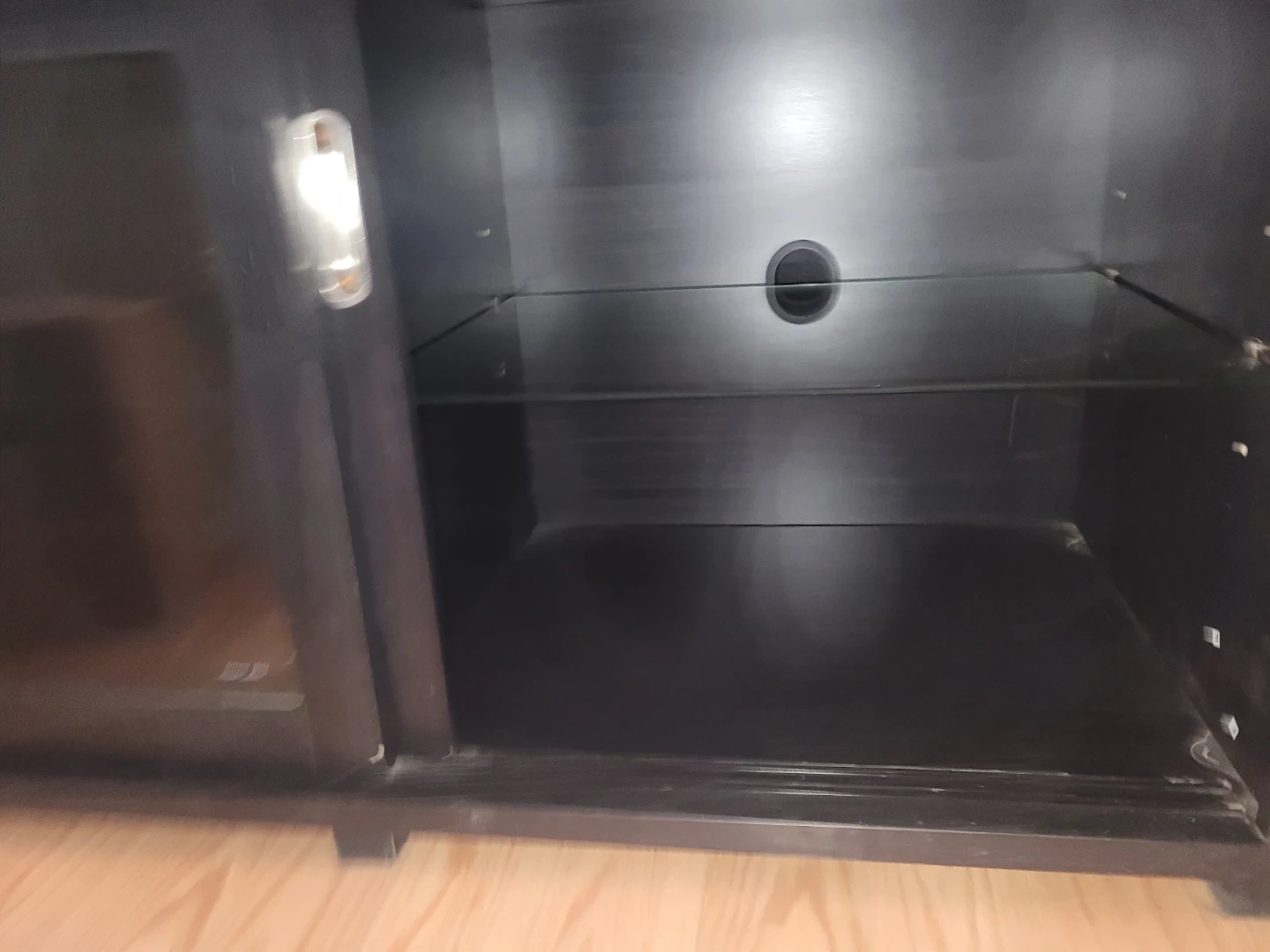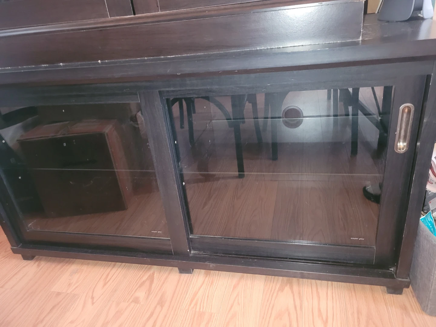 A dark wood media console with glass doors and adjustable shelves. It features a cable management hole in the back. This console is great for organizing electronics and media.