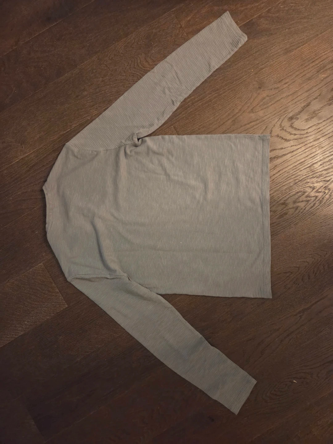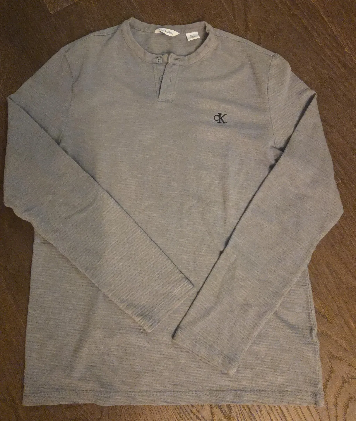 Grey Calvin Klein long sleeve henley t-shirt with CK logo detail. Made with a soft, textured fabric for comfort. Buttoned neckline adds a stylish touch.