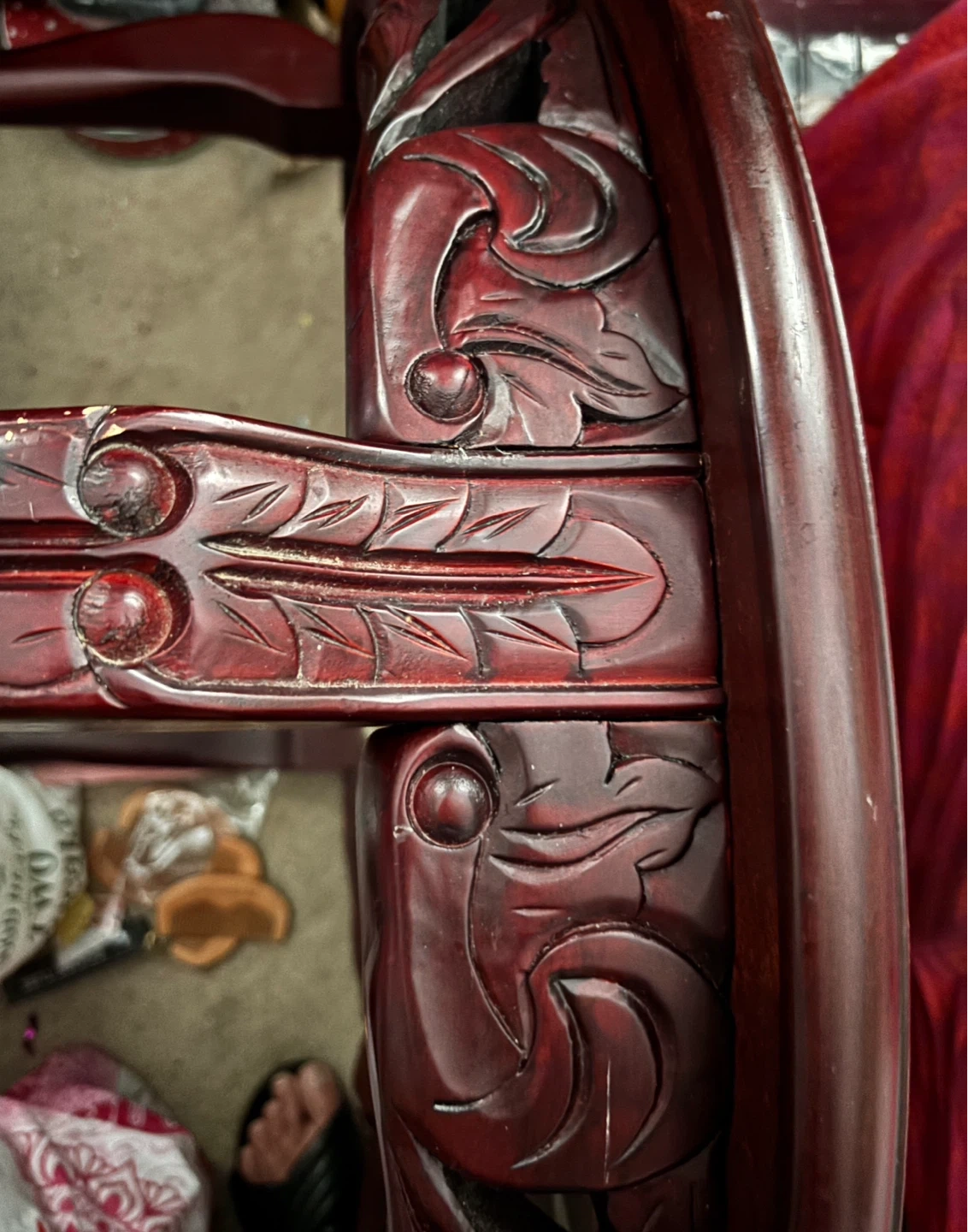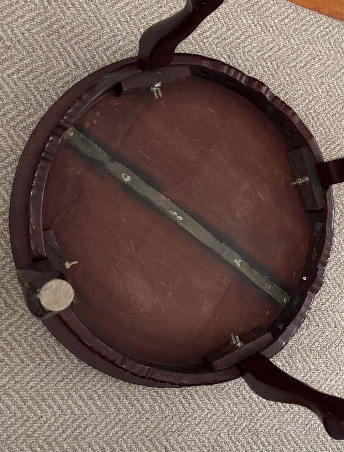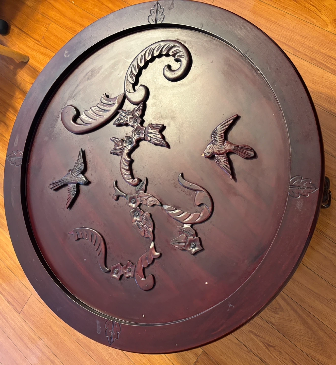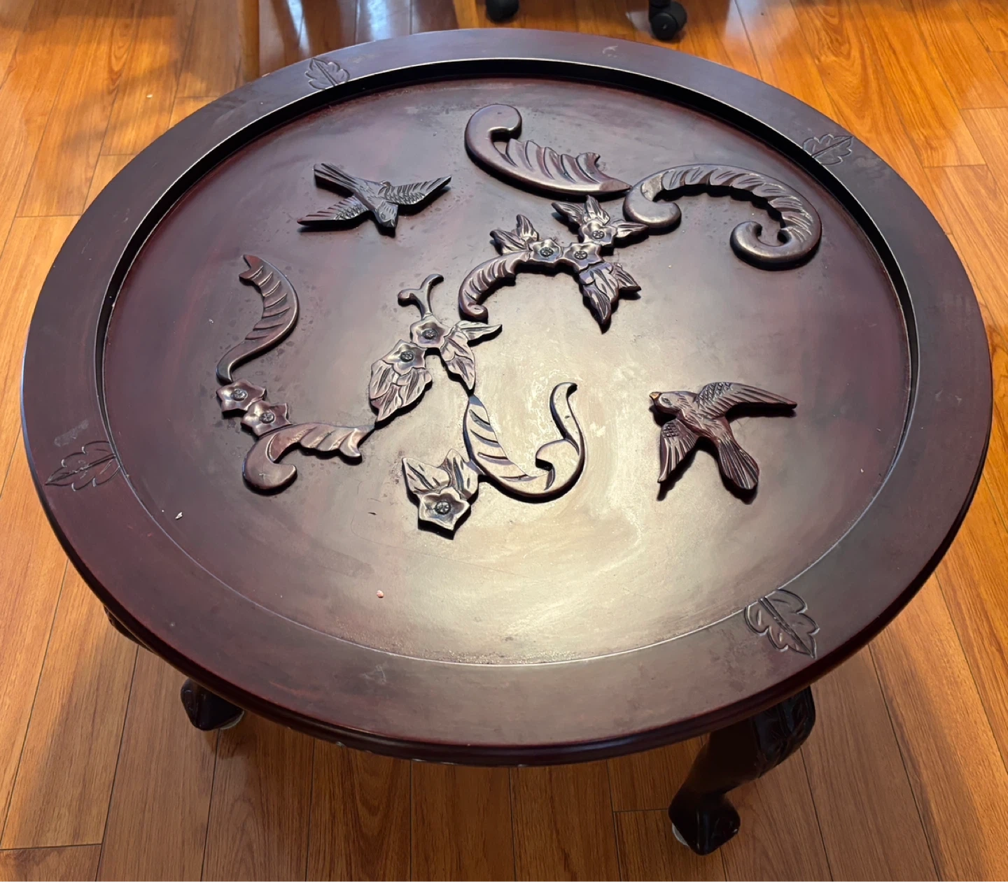 A beautifully carved dark wood coffee table in Chinese design featuring a bird and floral motif. Measurements … 30” diameter, 17” height. This round table has ornate legs and a decorative top surface. It's made of solid wood.