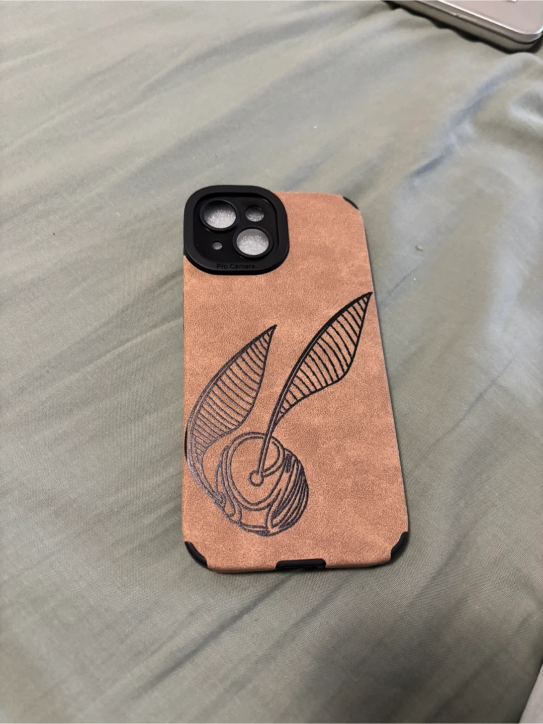 Tan coloured phone case with a black border, featuring a debossed Golden Snitch design.