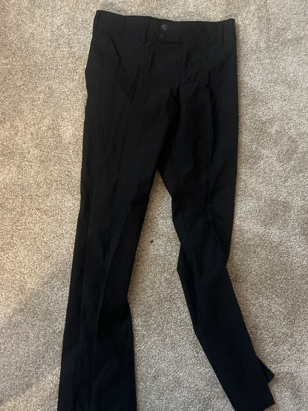 Selling a pair of black dress pants! They are in great condition and would be a great addition to your wardrobe. They are a solid black colour and are made of a comfortable material.