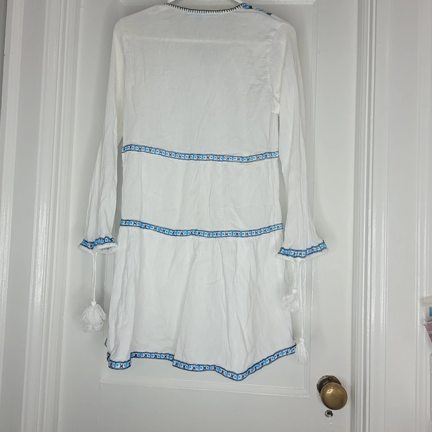 White long-sleeve tunic dress with blue embroidery and tassel details. Size is small. This dress is perfect for a beach vacation or casual summer wear!