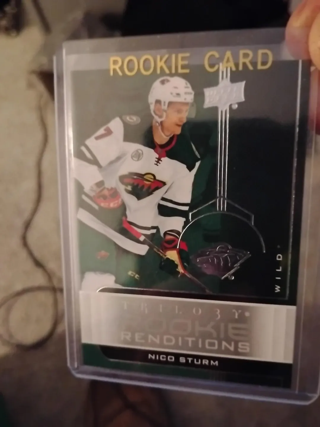This is a 2021-22 Trilogy Rookie Renditions hockey card featuring Nico Sturm. It's a collectible card for hockey fans. The card is in a protective sleeve.