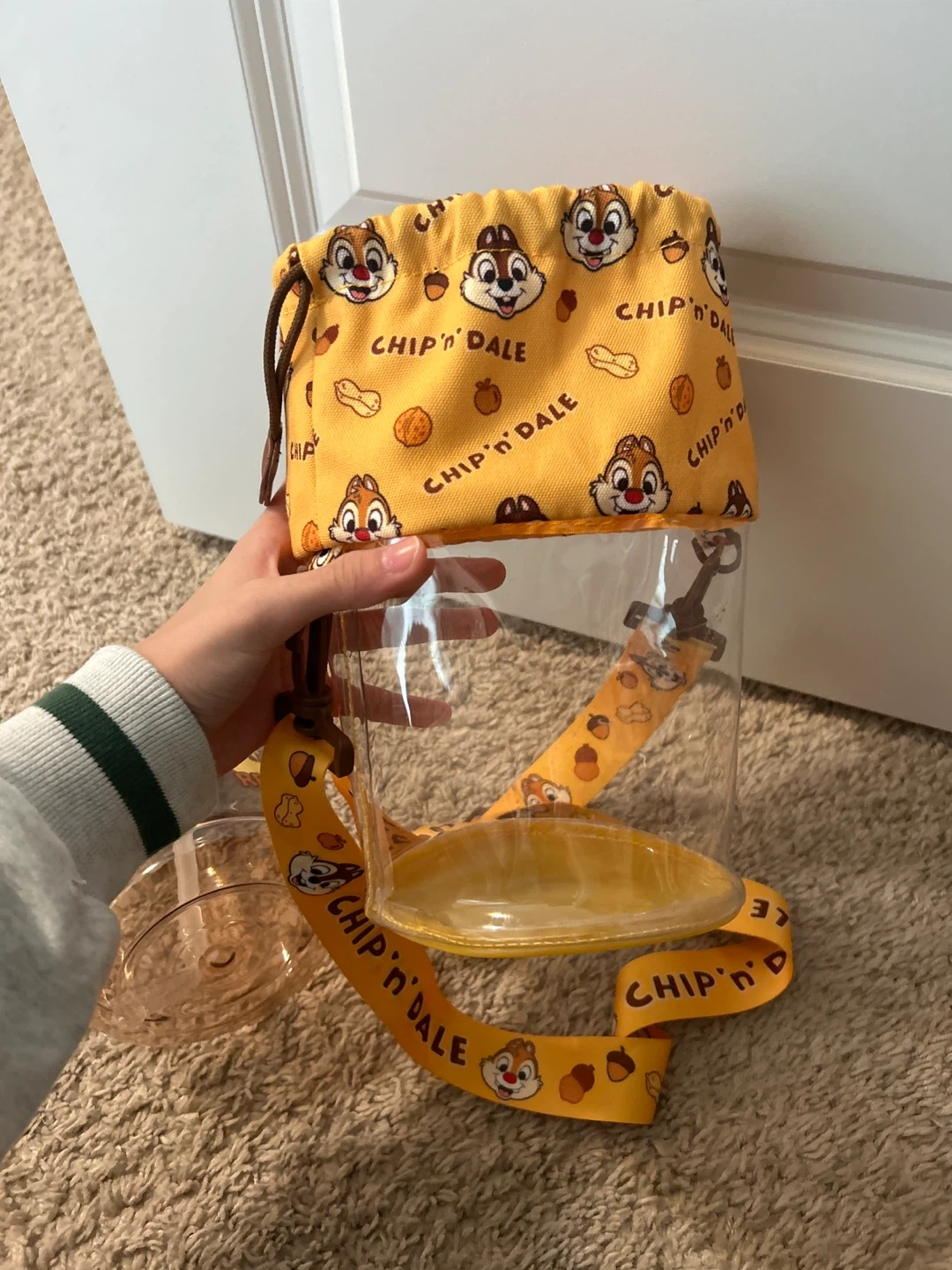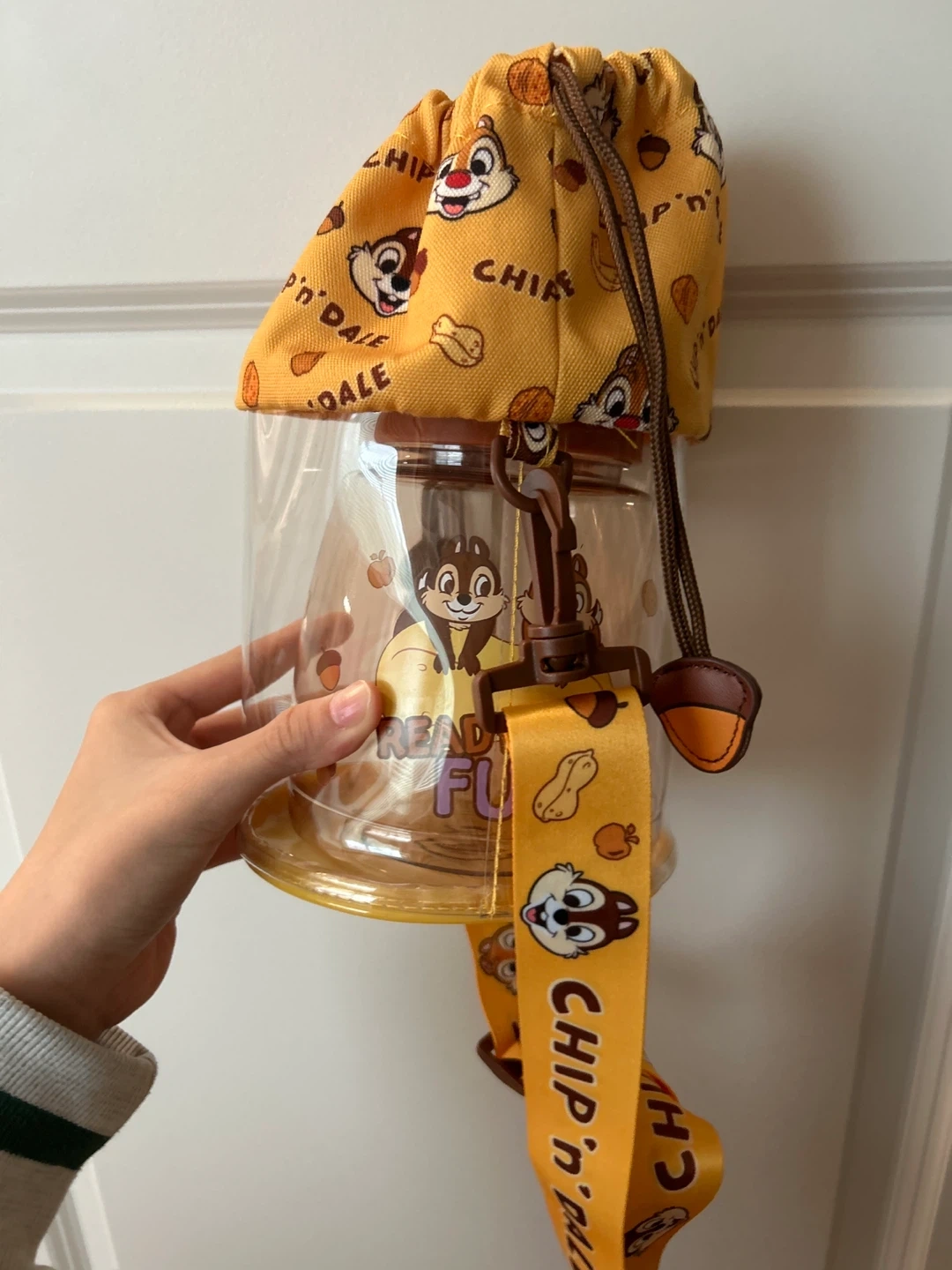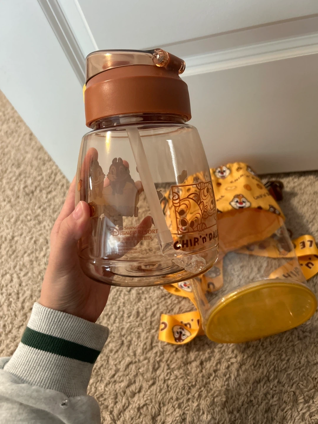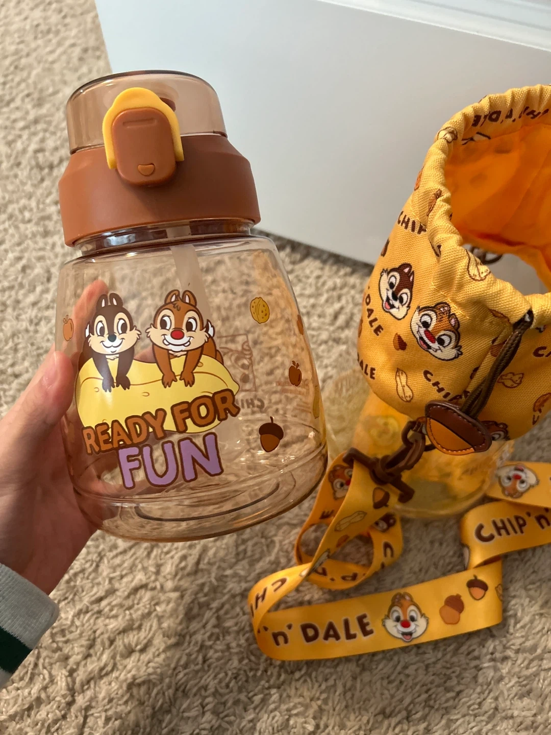 This is a cute Chip 'n Dale water bottle, perfect for on-the-go hydration. It comes with a fun, adjustable lanyard for easy carrying. The bottle features characters Chip and Dale and has a straw for sipping. Shanghai China limited design