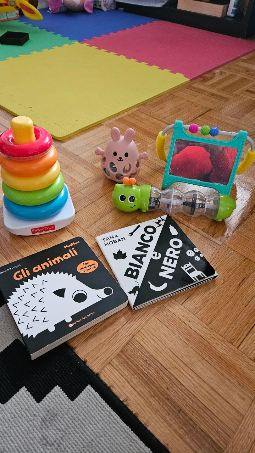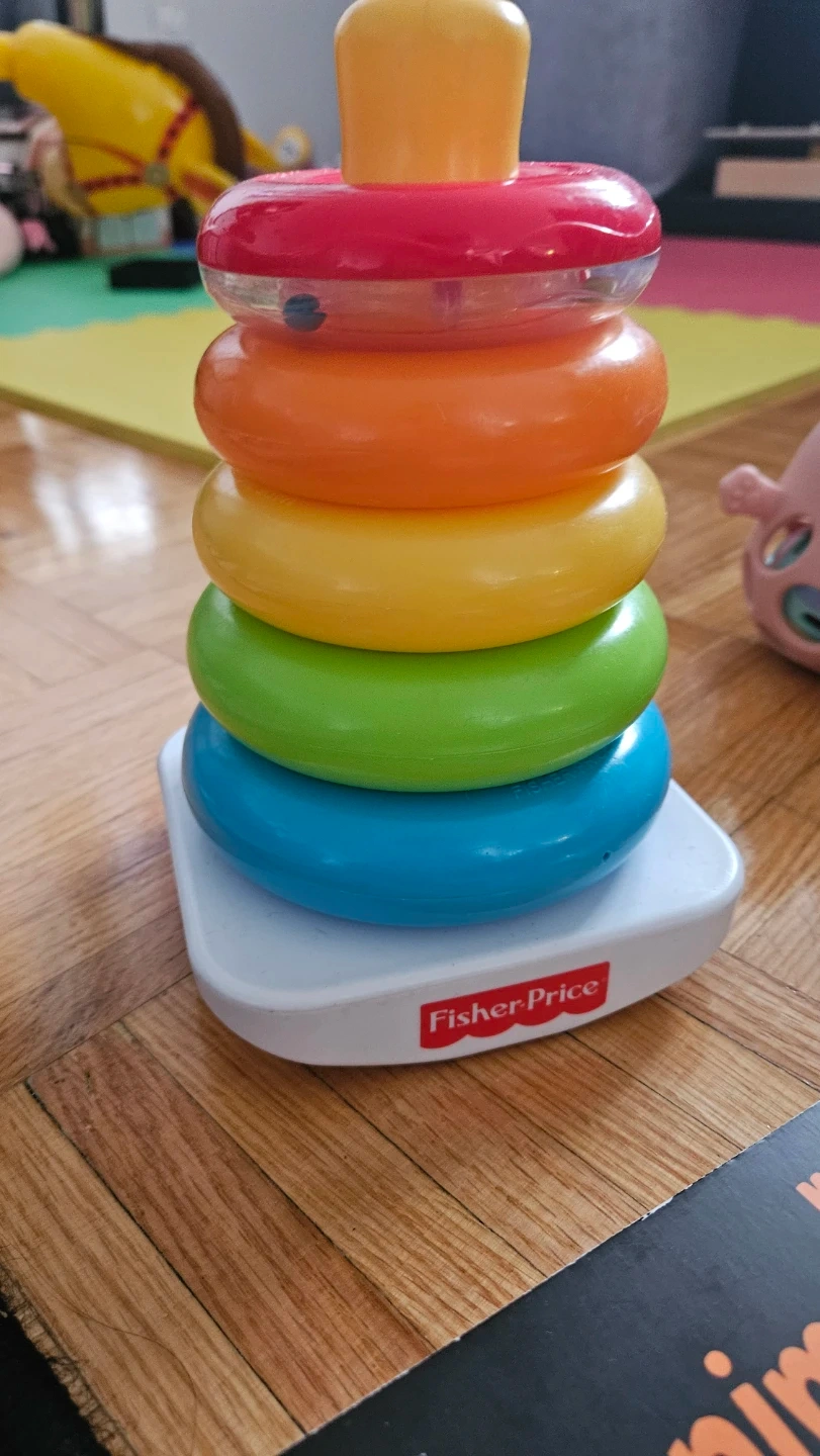 Classic Fisher-Price Rock-a-Stack toy with five colourful rings. Great for baby's development and sensory exploration. Includes the stacker base and rings.