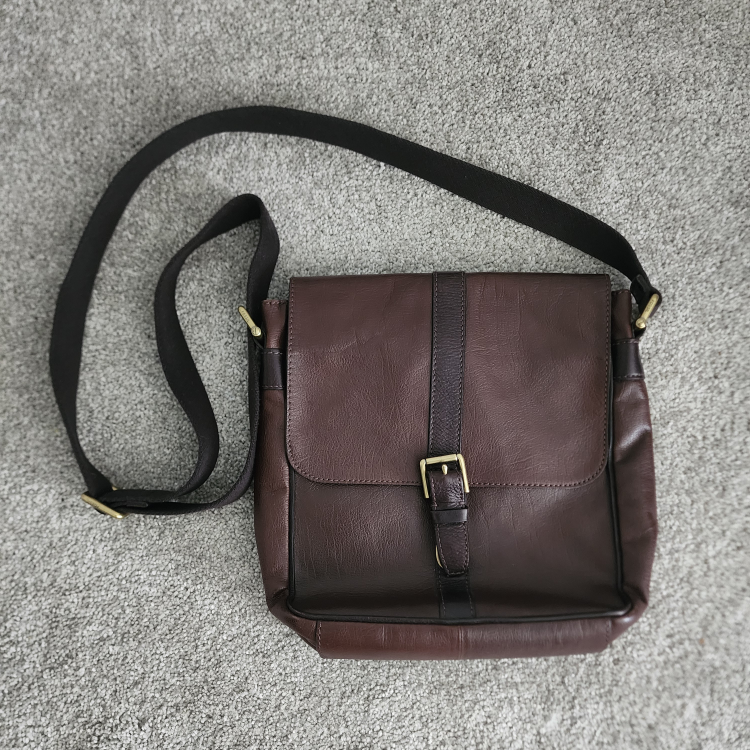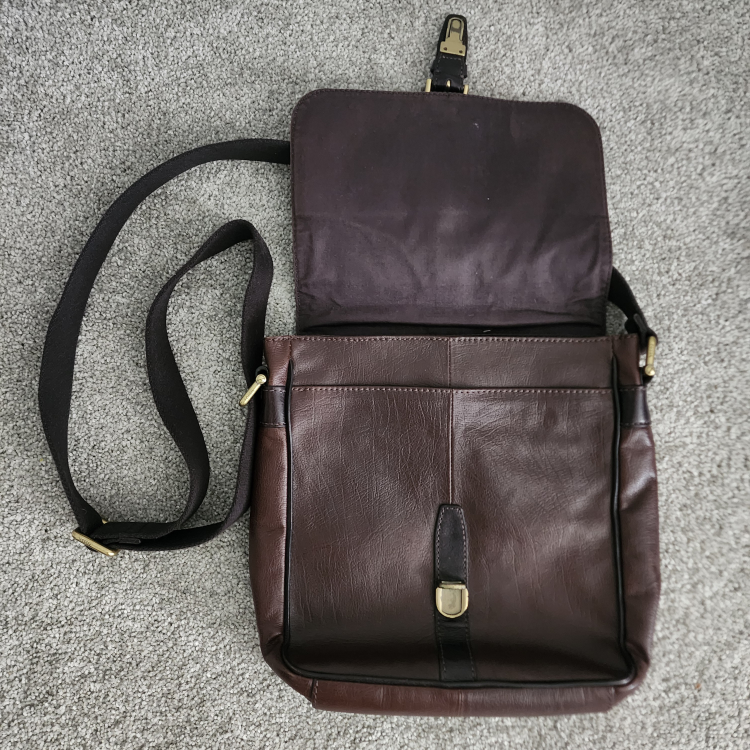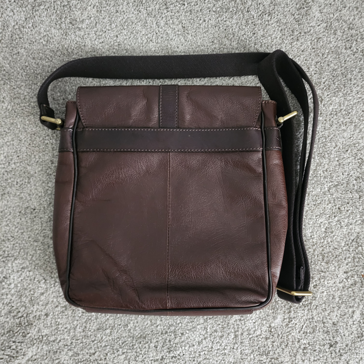 I'm selling a Fossil messenger bag in brown leather. It's in great condition and perfect for carrying your essentials around town. It features a comfortable shoulder strap and a classic design that will never go out of style. The bag is made of high-quality leather, ensuring durability and a stylish look.
