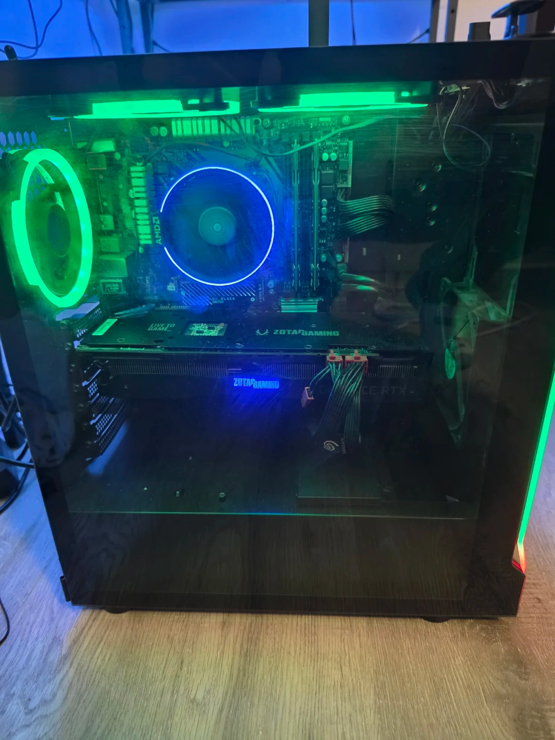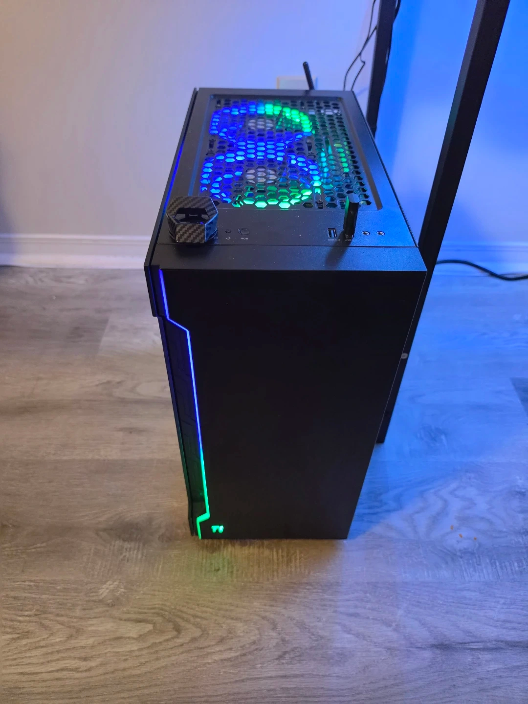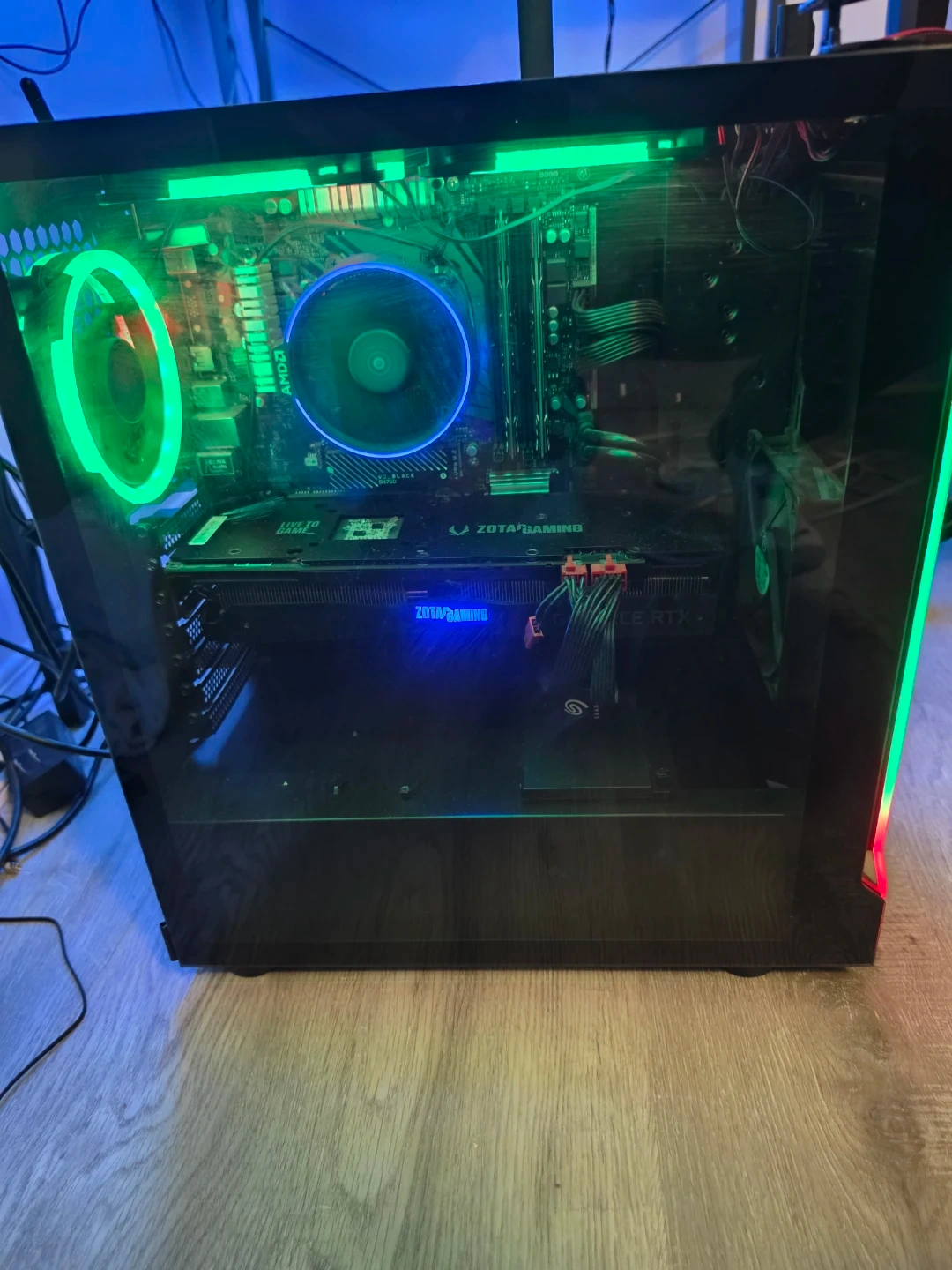 Custom built gaming PC featuring an AMD Ryzen 7 2700 processor and an NVIDIA GeForce RTX 2060 super 8gb graphics card. It comes with 16GB of RAM and an 750 SSD for fast storage. The case has customizable RGB lighting.