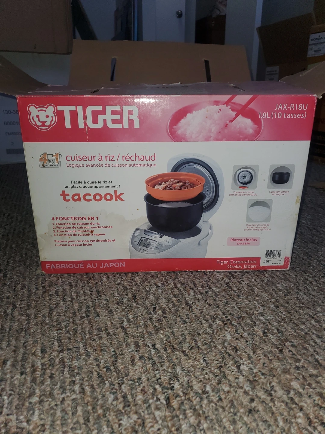 Tiger JAX-R18U rice cooker with automatic cooking logic. It's 1.8L (10 cup) capacity and includes a recipe book. Comes with a steam basket, inner bowl, and sync-cooking tray.