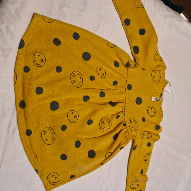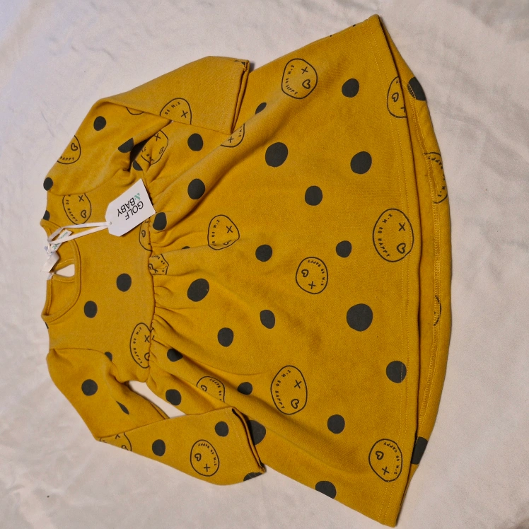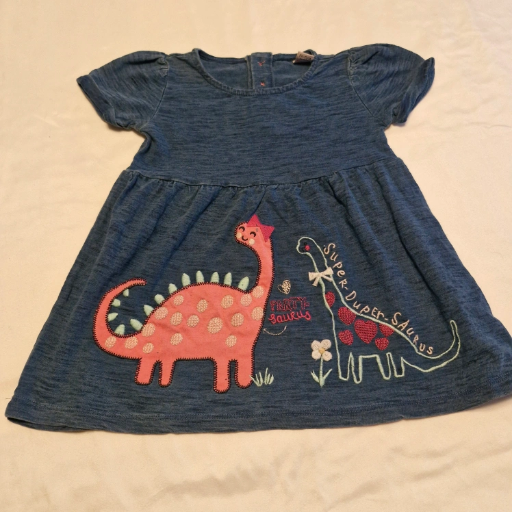 Adorable bundle including two girls' dresses. One mustard yellow dress features grey polka dots and playful graphics. The second dress is denim blue with embroidered dinosaurs. Both dresses appear to be in good condition, suitable for everyday wear.