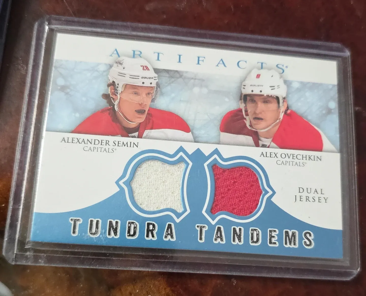 2010-11 Upper Deck Artifacts hockey card featuring Alexander Semin and Alex Ovechkin dual jersey. It's a Tundra Tandems card with game-worn jersey pieces included.