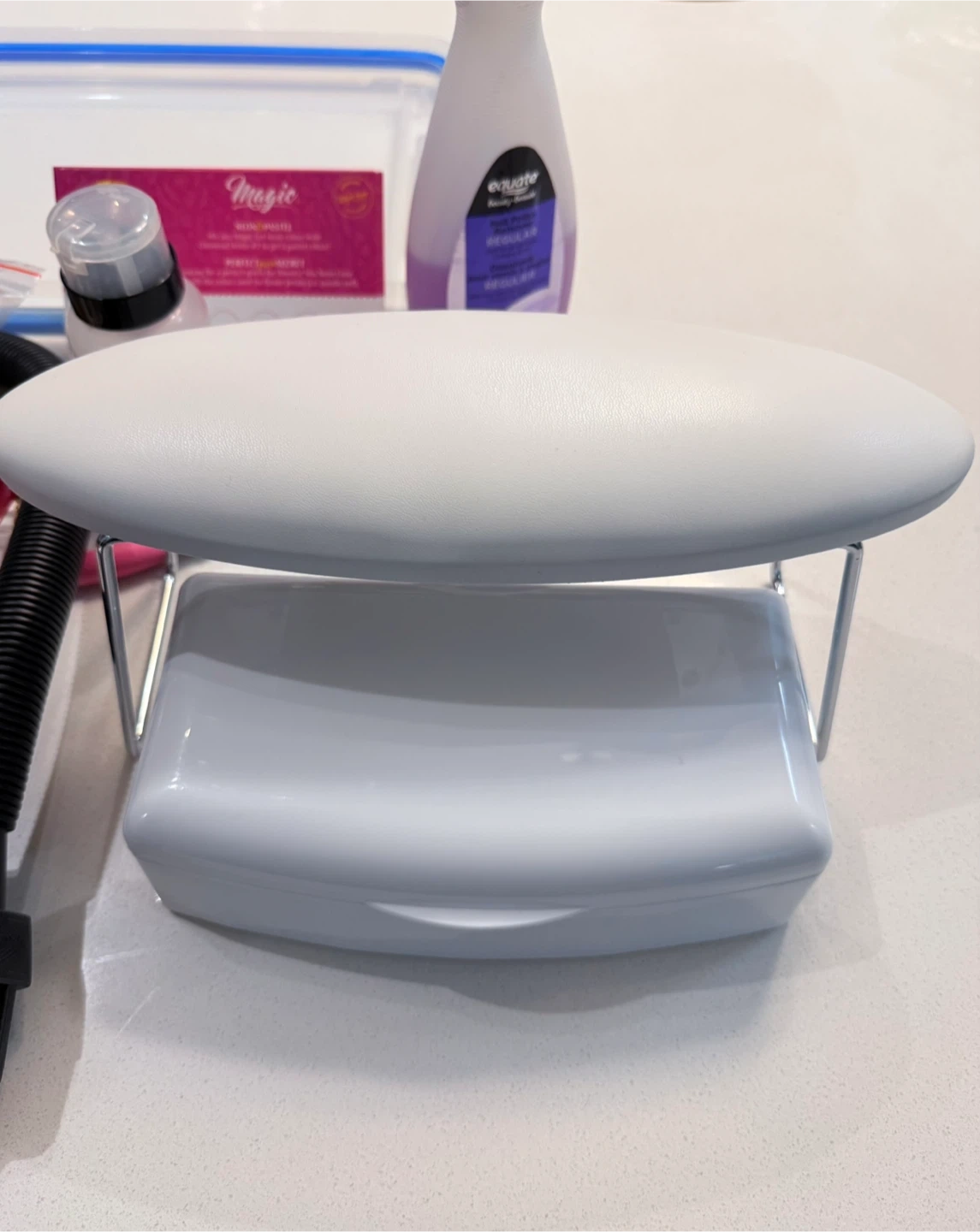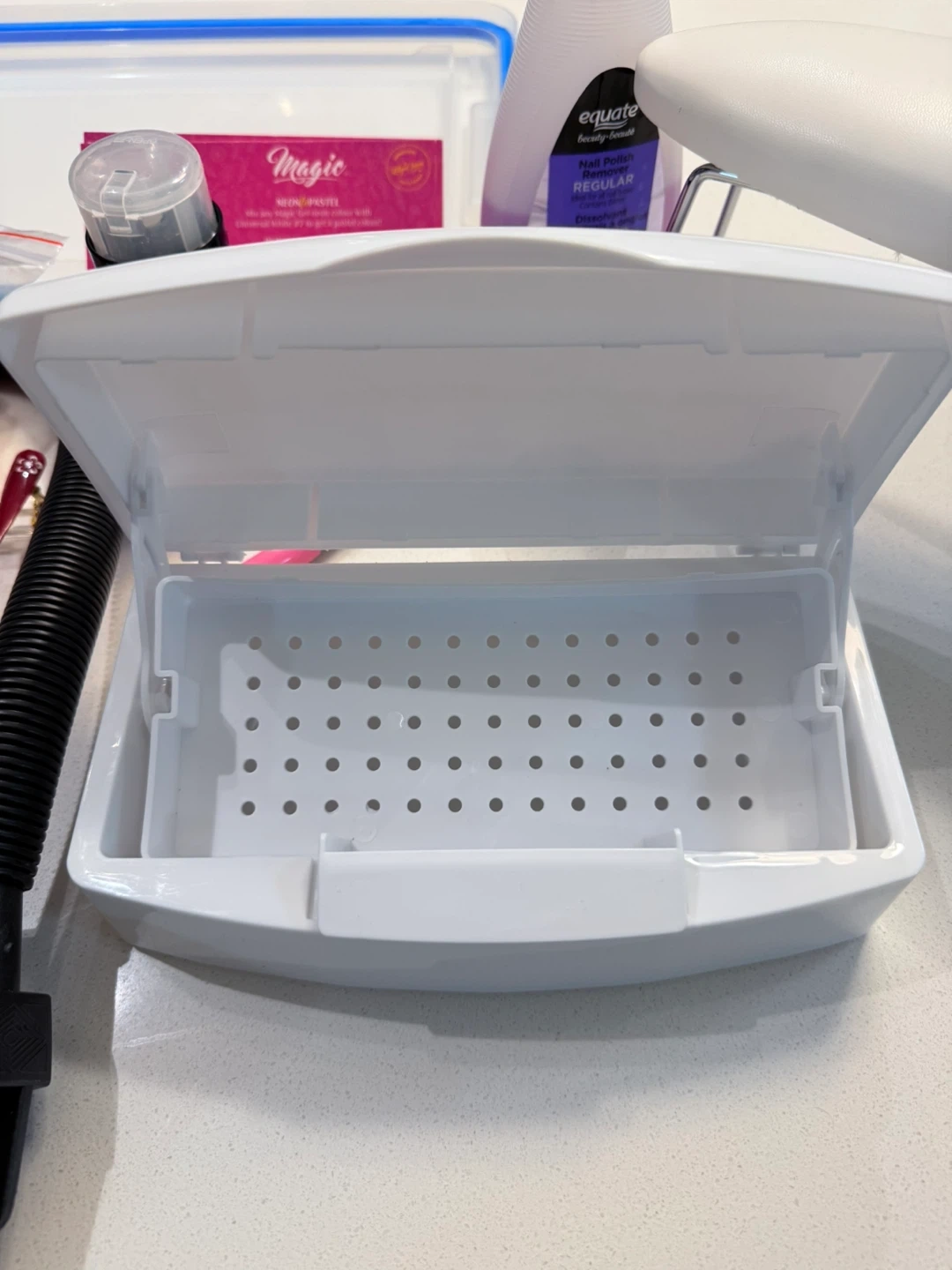 Selling a nail practice hand kit! It includes a practice hand with adjustable arm, nail tips, a nail clipper, Nail Tool Sterilizer Disinfecting tray (never used) and arm rest.