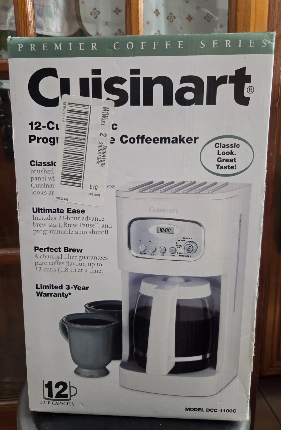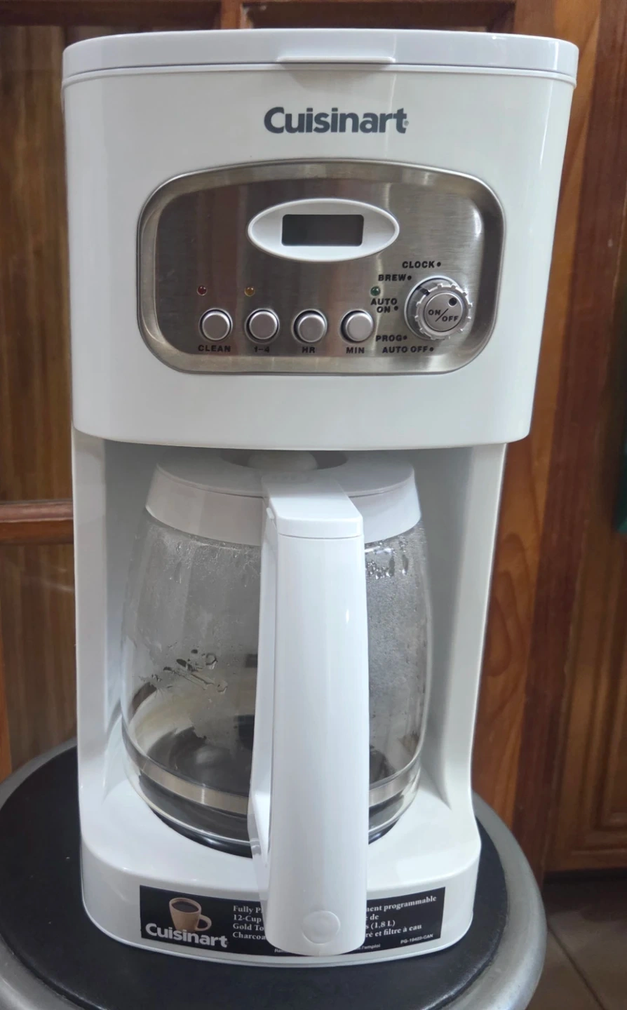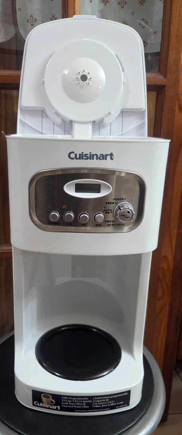 This Cuisinart coffeemaker brews up to 12 cups (1.8 L). It offers 24-hour advance brew start, brew pause, and programmable auto shutoff. A charcoal filter ensures pure coffee flavour.