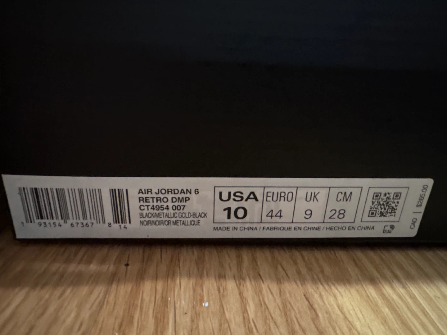 Air Jordan 6 Retro DMP Black/Gold, Size 10