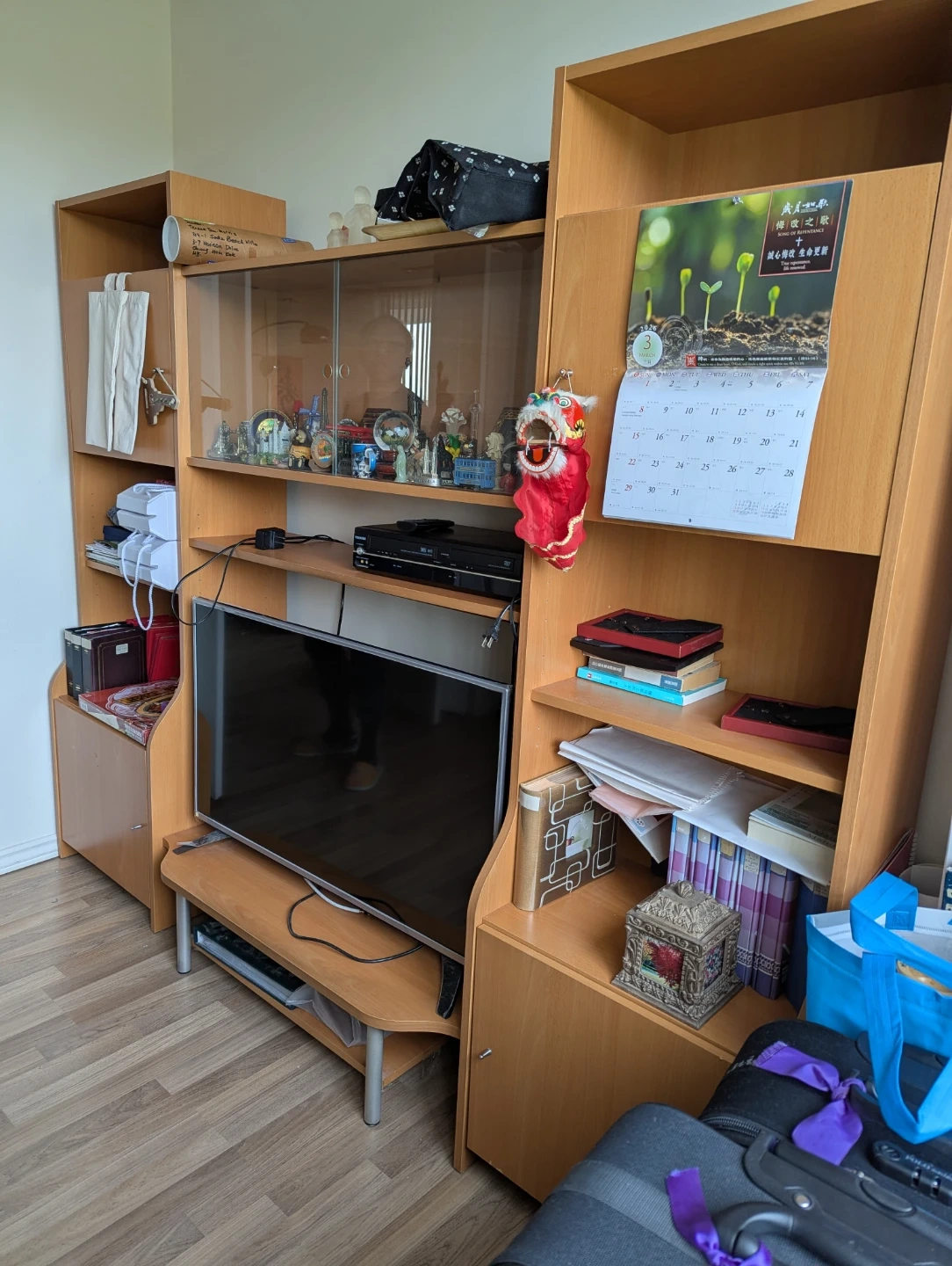IKEA entertainment unit is made of light wood and features multiple shelves and glass-fronted cabinets. It includes a TV stand with space for media devices. It's a great option for organizing your living room.