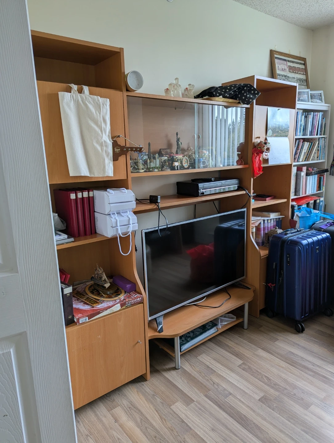 IKEA entertainment unit is made of light wood and features multiple shelves and glass-fronted cabinets. It includes a TV stand with space for media devices. It's a great option for organizing your living room.