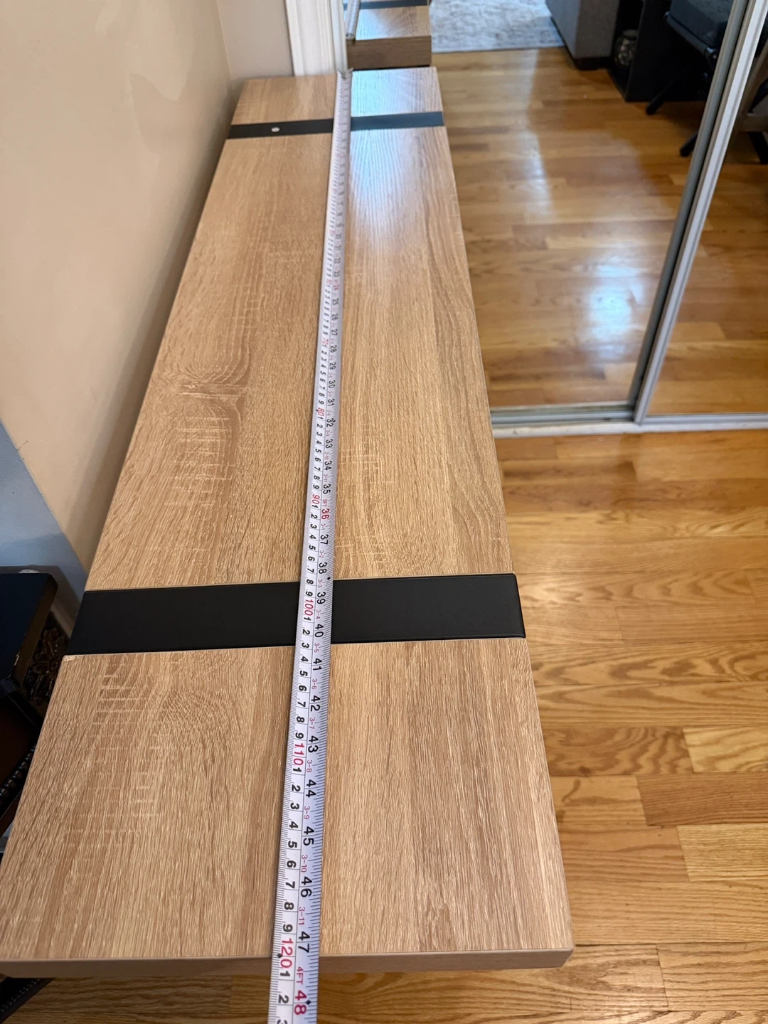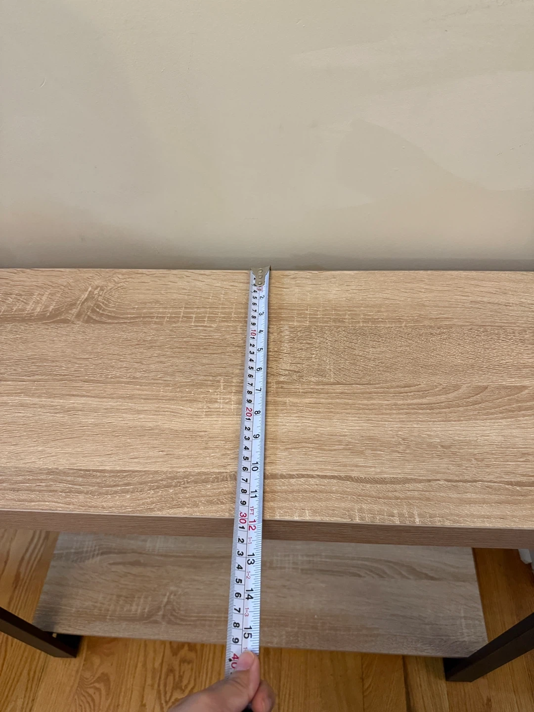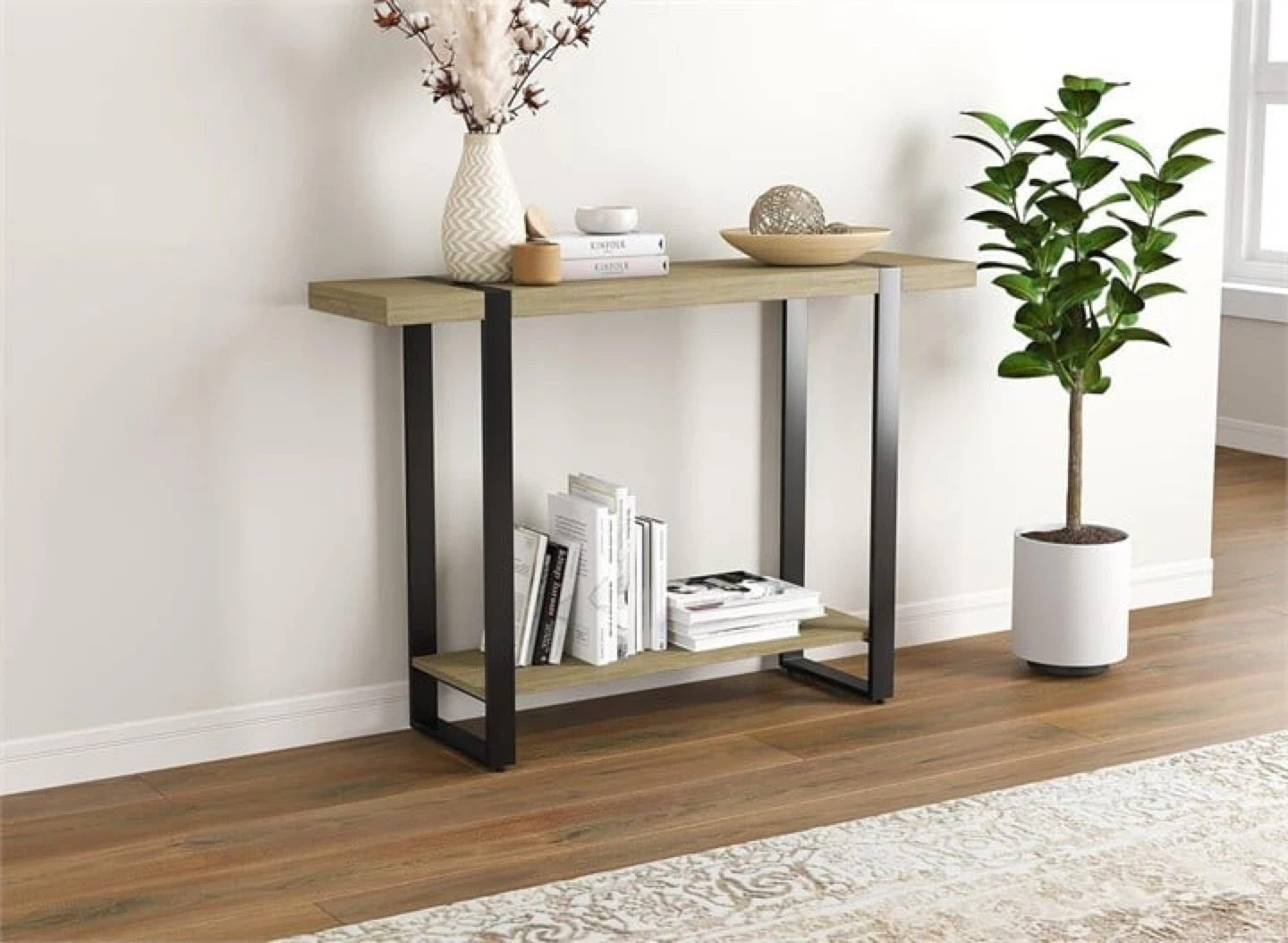 This fully assembled new console table features a modern oak-look laminate top and shelves with a sturdy black metal frame. Its slim profile is perfect for entryways or behind a sofa. Measurements: Height is 32 inches, Depth is 12 inches, Length is 40 inches.