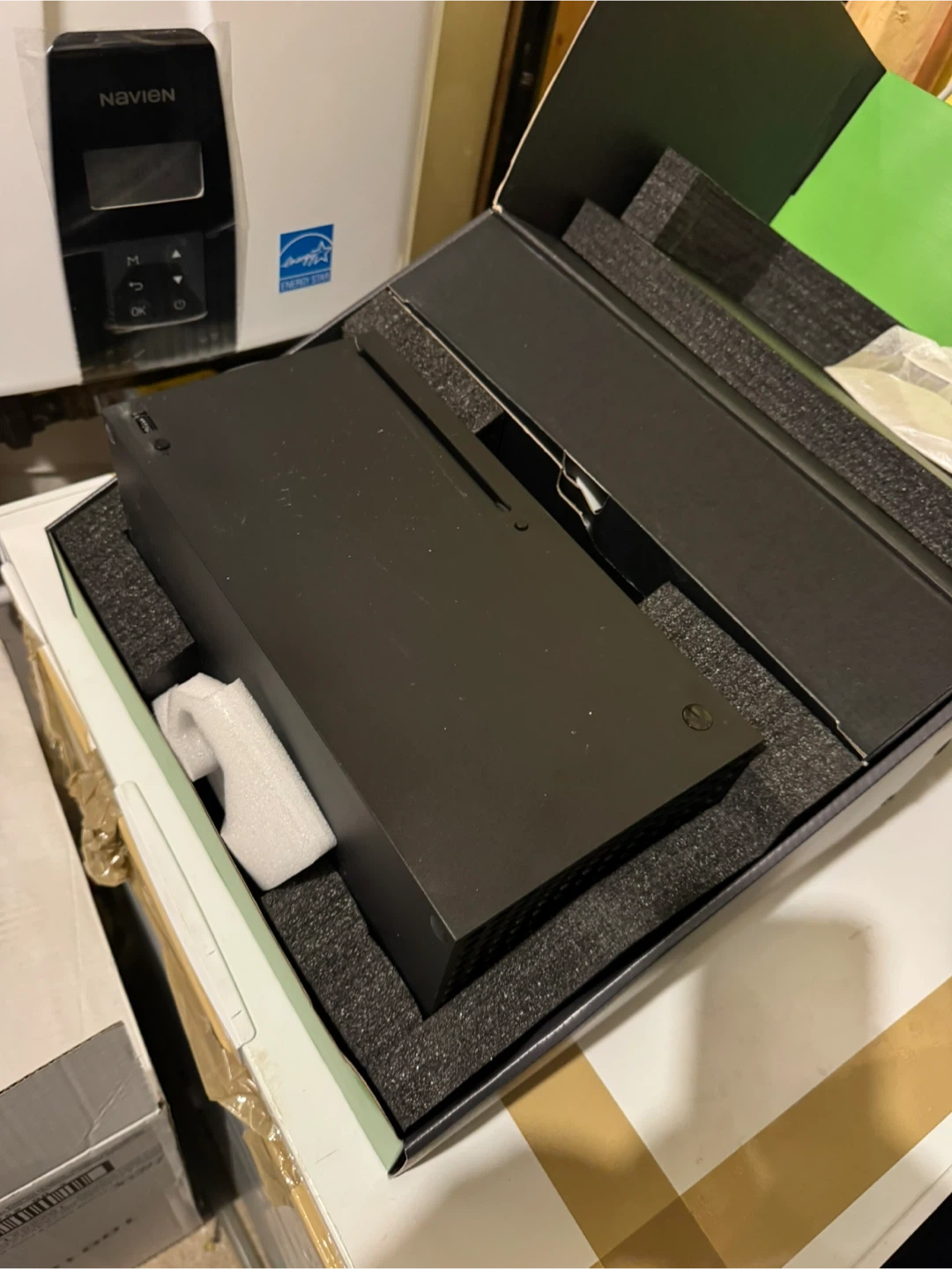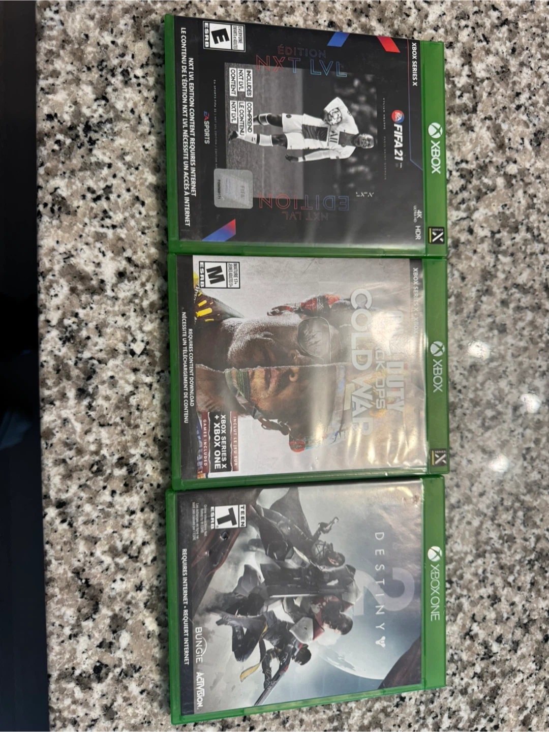 Selling an Xbox Series X 1TB console in black. Includes original packaging, one controller, and three games: Destiny 2, Call of Duty Black Ops Cold War, and FIFA 21. It's ready for some serious gaming!