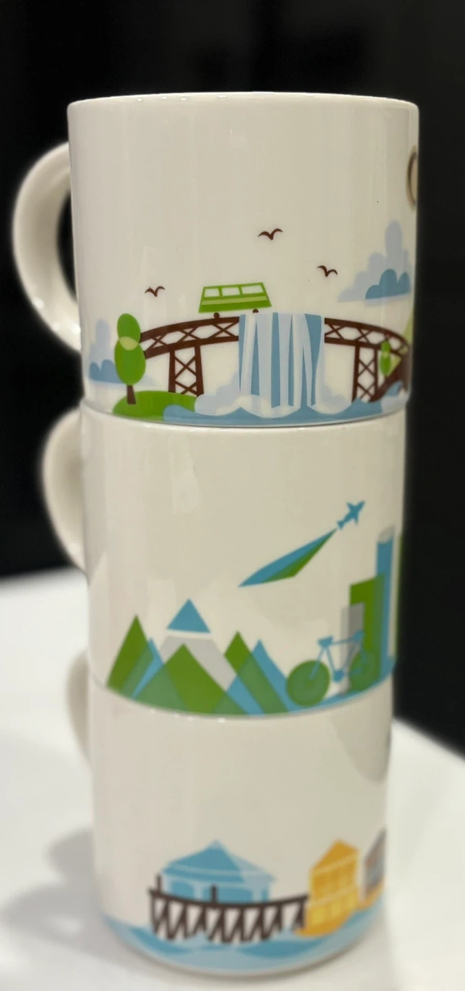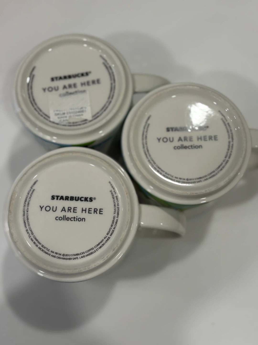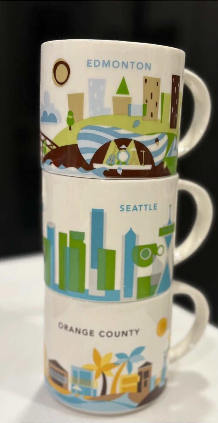 Three Starbucks "You Are Here" collection mugs from Edmonton, Seattle, and Orange County. Each mug features unique city skyline graphics and colourful interiors. They're dishwasher and microwave safe. some utensil marks