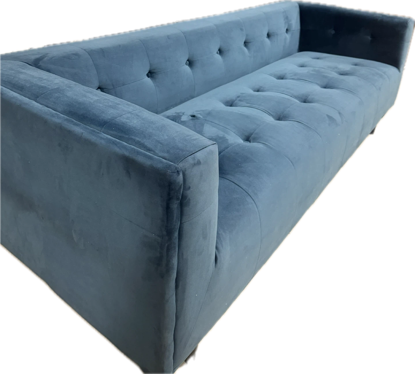 This stylish sofa is upholstered in a navy velvet fabric with deep button tufting. It features a modern design with clean lines and a comfortable seat. Great for adding a touch of elegance to any living space!