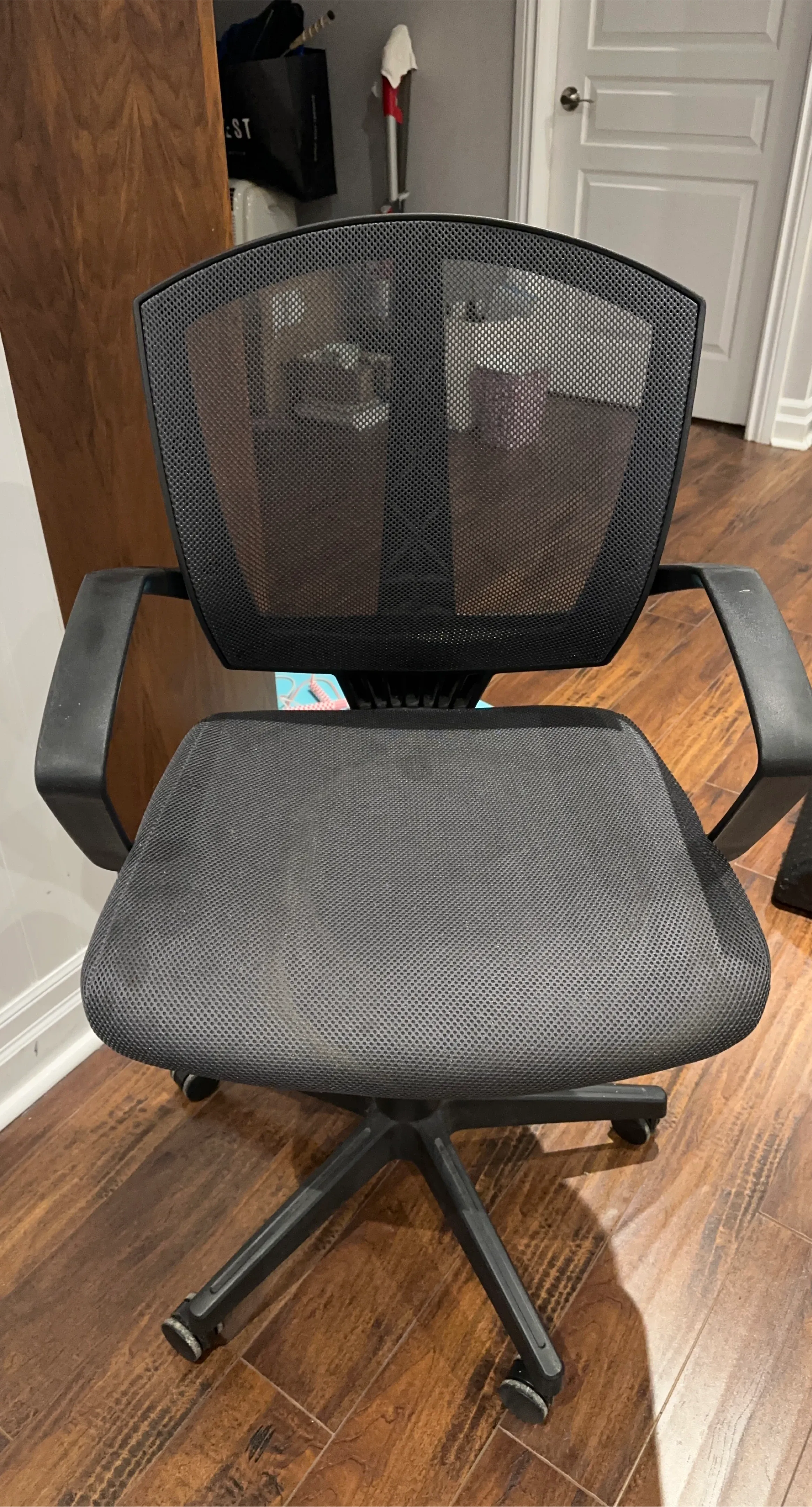 This is a black mesh office chair with armrests. It features a five-star base with wheels for easy mobility. The mesh back provides breathability for comfort. Suitable for home or office use.