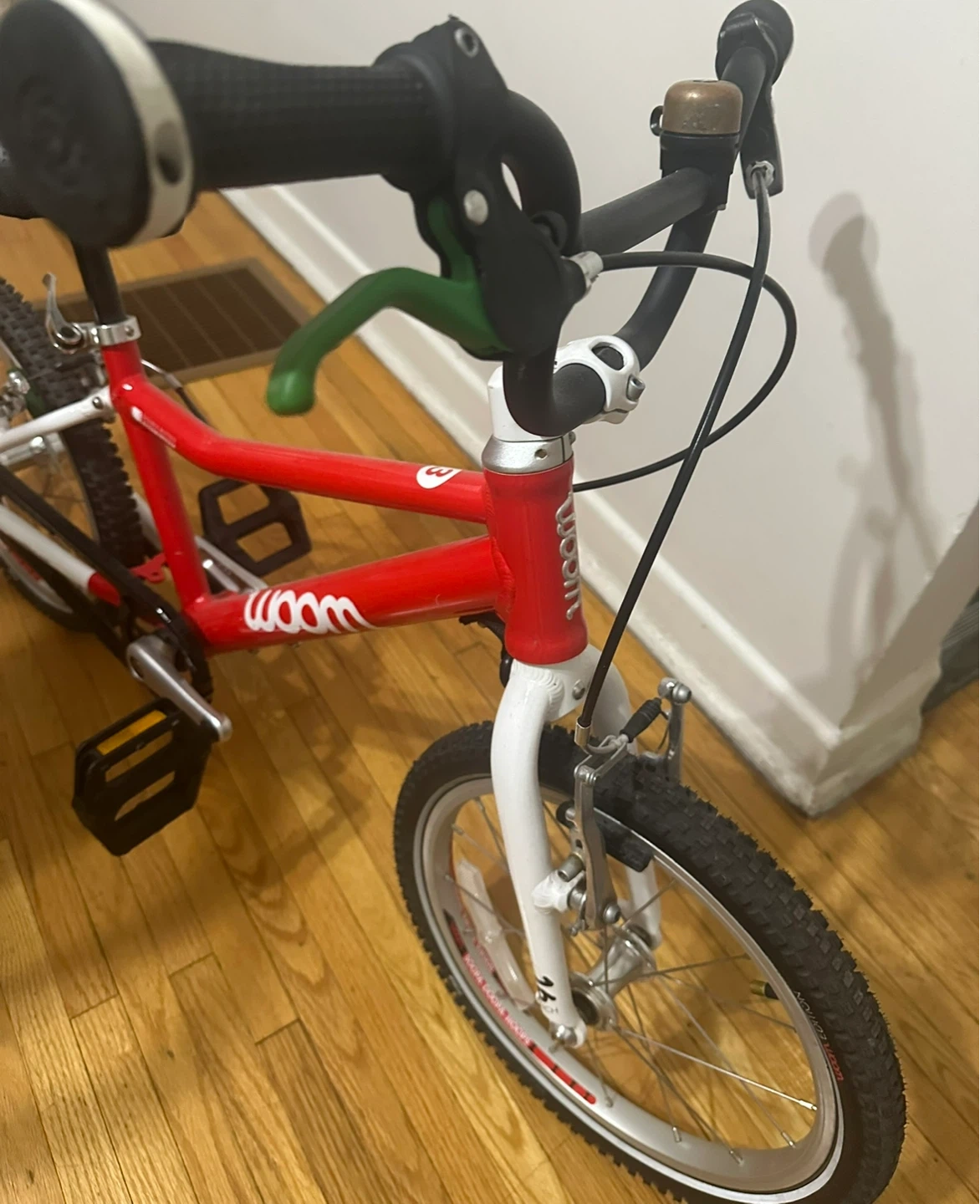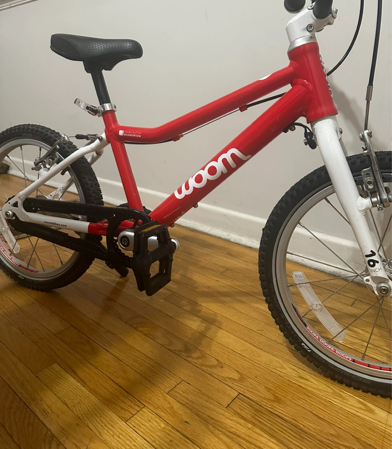 Woom 3 kids bike in a vibrant red. Features a lightweight aluminium frame and 16-inch wheels. Great for learning to ride!