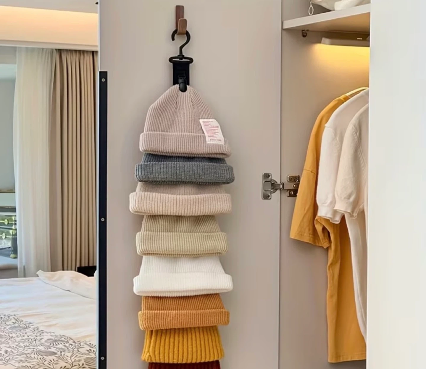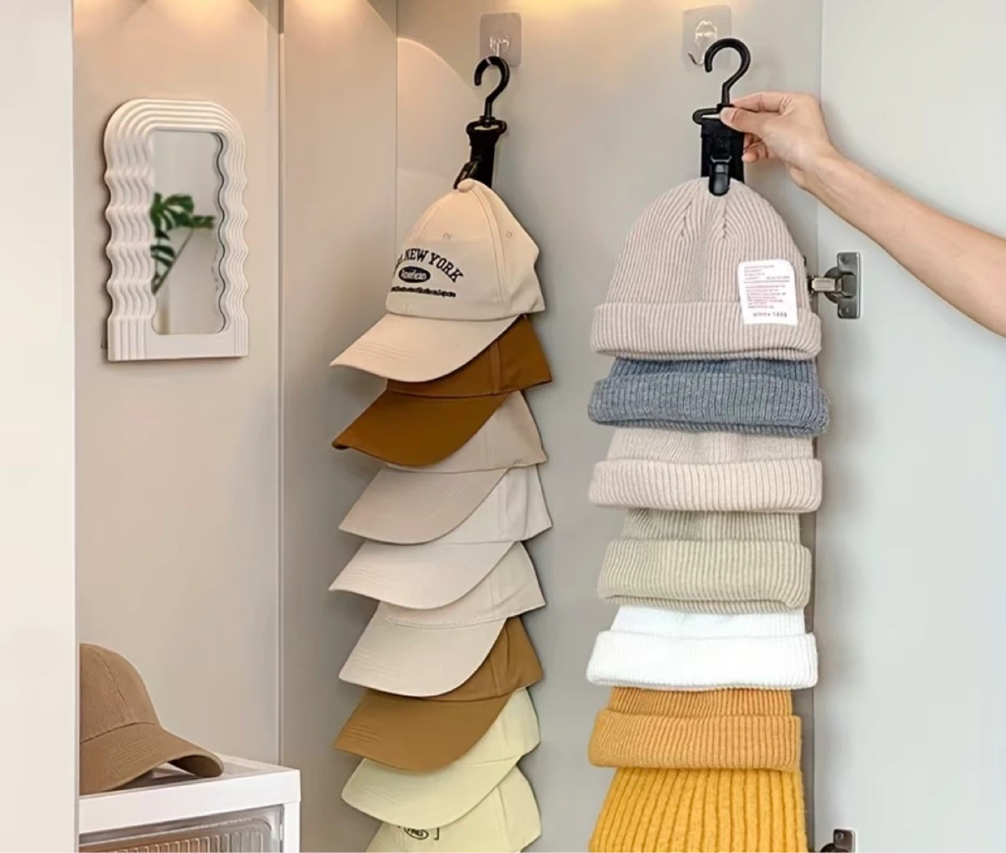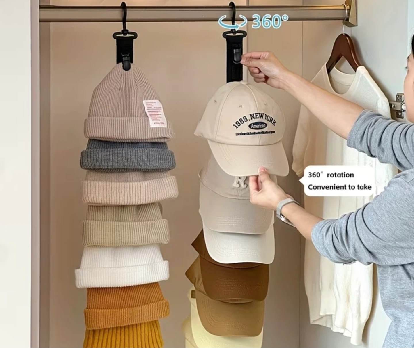 This hanging organizer is perfect for storing your hats and keeping them neat. It features 8 seamless anti-slip clips for secure storage. The hanger rotates 360 degrees for convenient access to your hats. It's ideal for saving closet space and maintaining hat shape.