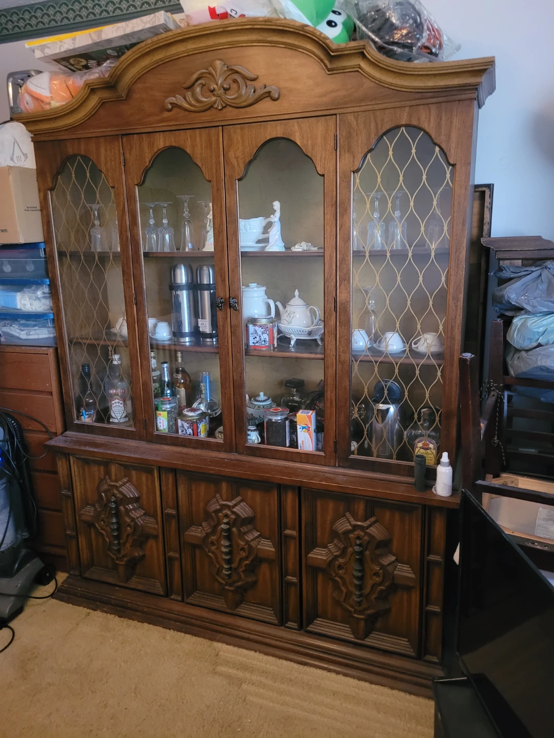 Selling a vintage wooden china cabinet. It has glass doors on the top half and wooden doors on the bottom. Great for displaying your favourite items and adding a touch of classic charm to your home, also matching table and four chairs.