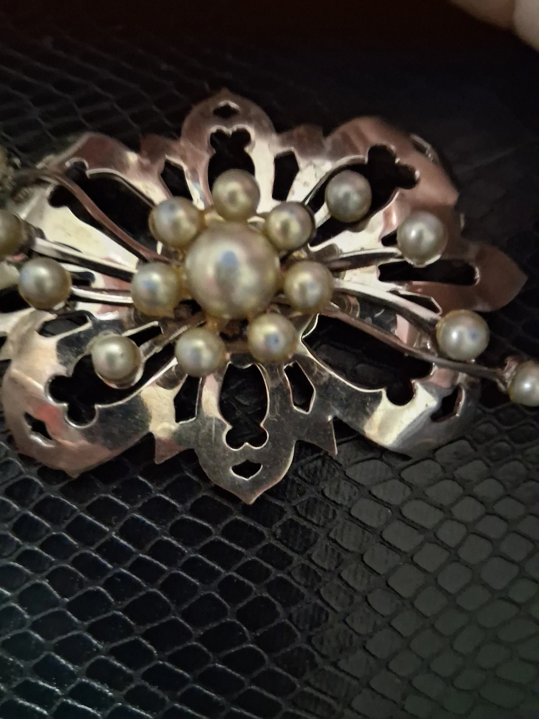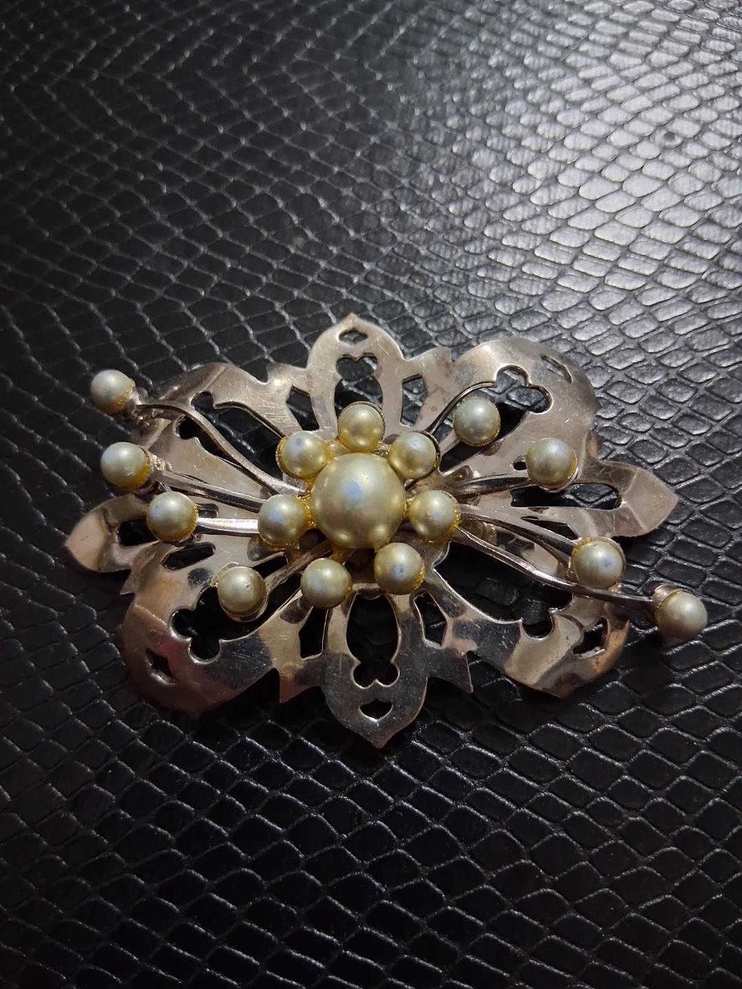 A decorative brooch featuring a floral-inspired design with faux pearls. This piece has a silver-tone finish and intricate cut-out details. It's a lovely accessory for blouses or scarves. ( Pearls look more Grey than what's shown in picture)