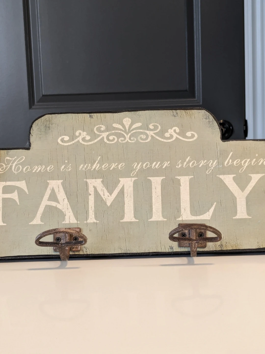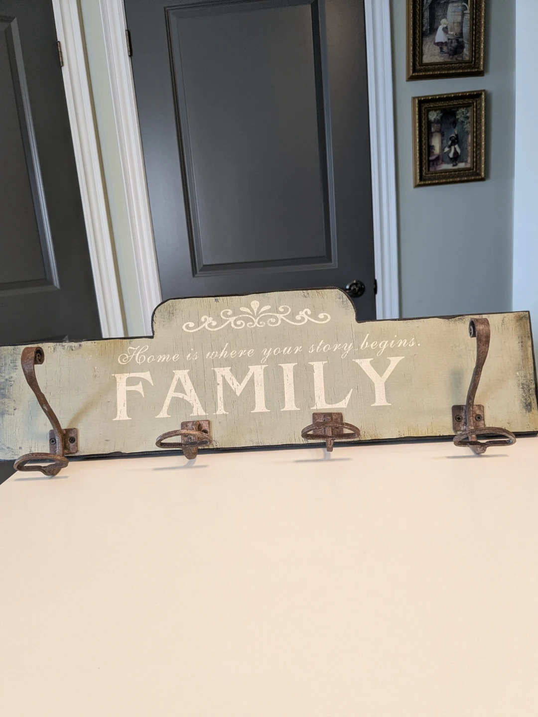 This decorative wall sign features the word "FAMILY" with the phrase "Home is where your story begins." It has four rustic metal hooks for hanging items. This piece adds a touch of charm and functionality to any entryway or living space.