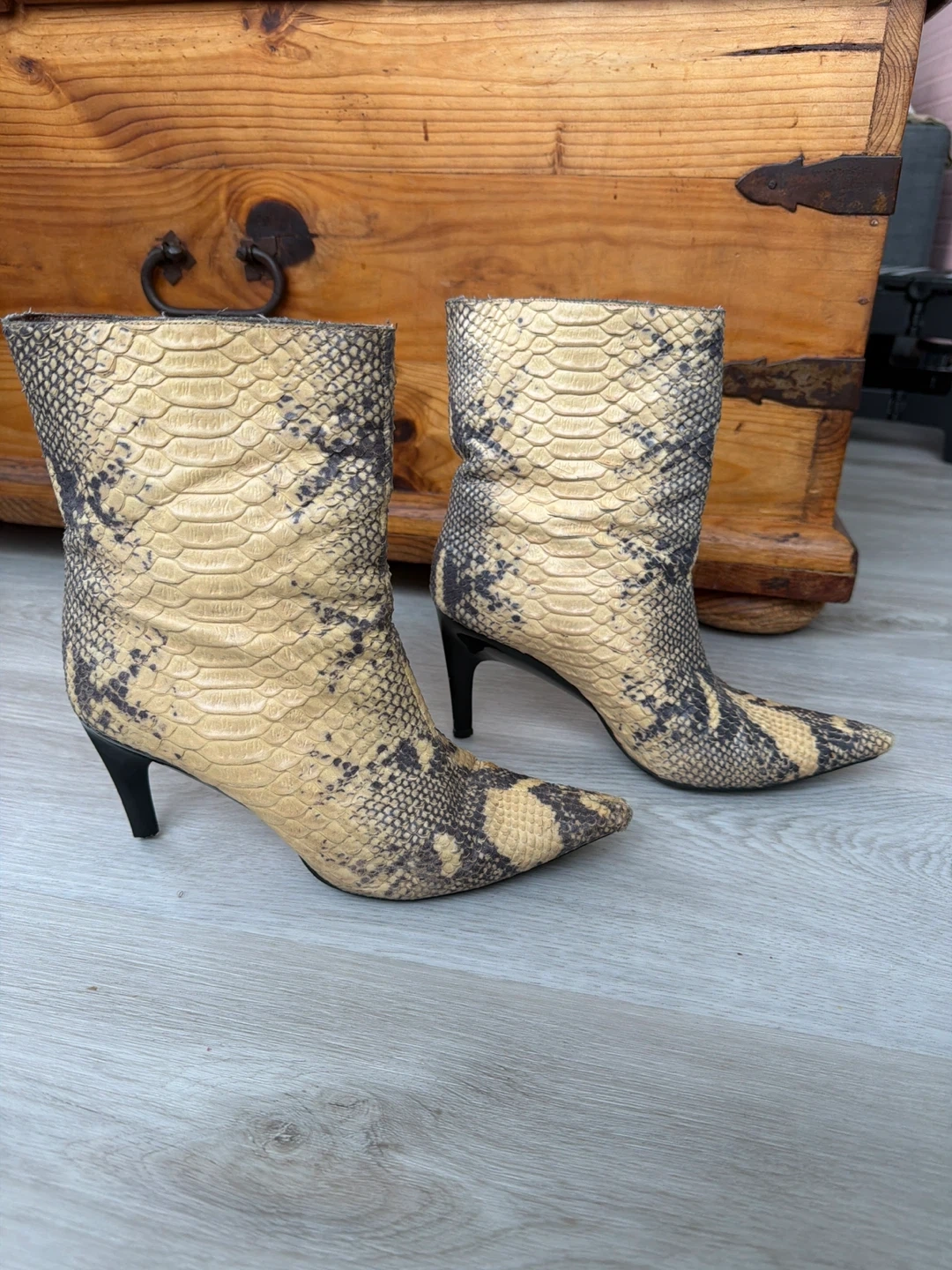 Stylish ankle boots featuring a snake print design. They have a pointed toe and a black stiletto heel. Perfect for adding a touch of flair to any outfit! Purchased for $275 size 6.5