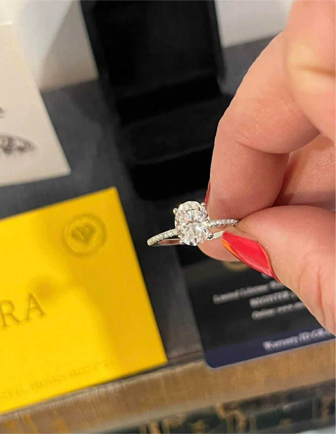 size 6,. Oval cut moissanite engagement ring with diamond accents. Comes with GRA Moissanite Report and original velvet box. Limited lifetime warranty included.