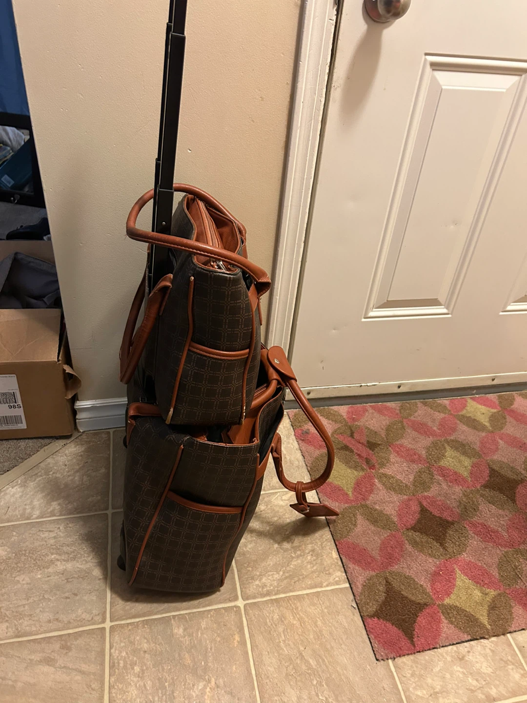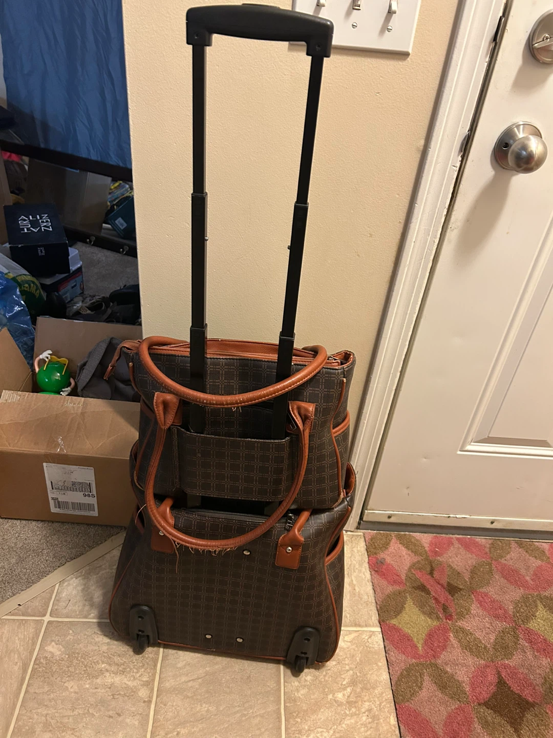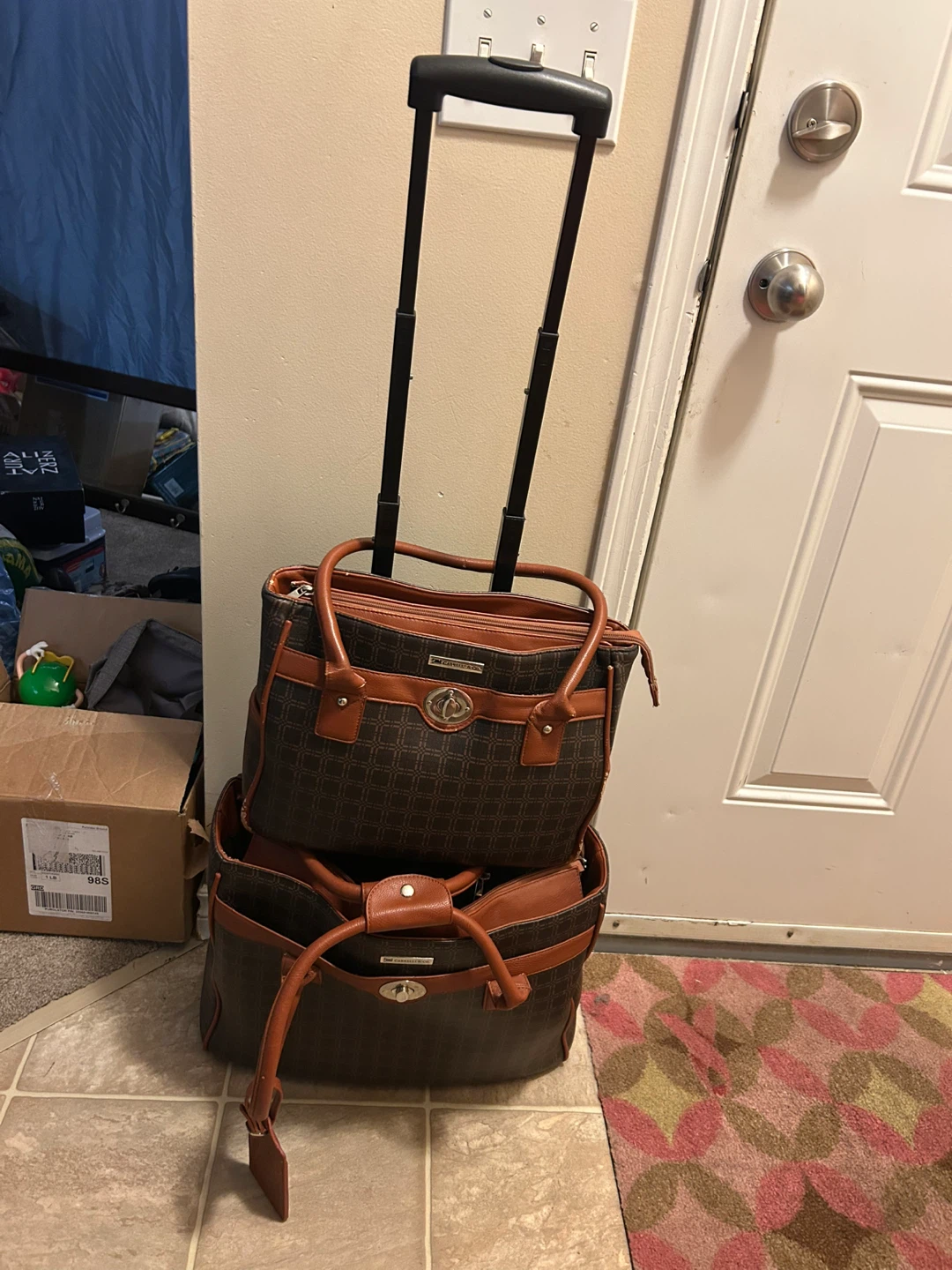 This rolling luggage set features a stylish brown monogrammed pattern with faux leather trim. It includes a smaller carry-on size bag that stacks on top of a larger rolling piece. Wheels and an extendable handle make it easy to transport.