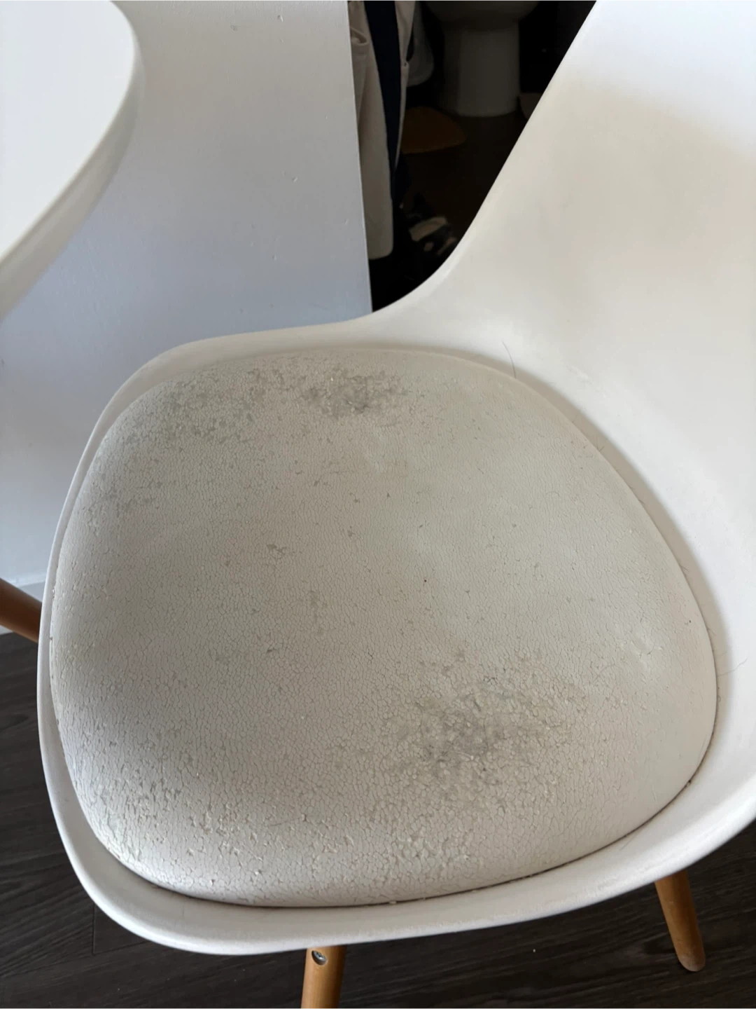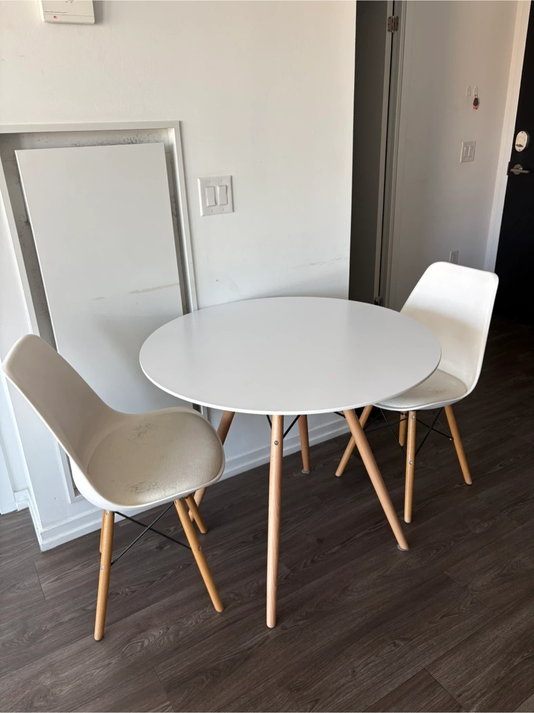 This is a white round dining table and two matching chairs from Structcube. The chairs have padded seats. They're great for small spaces! Table a few months old but rarely used, chairs are older from previous apartment.