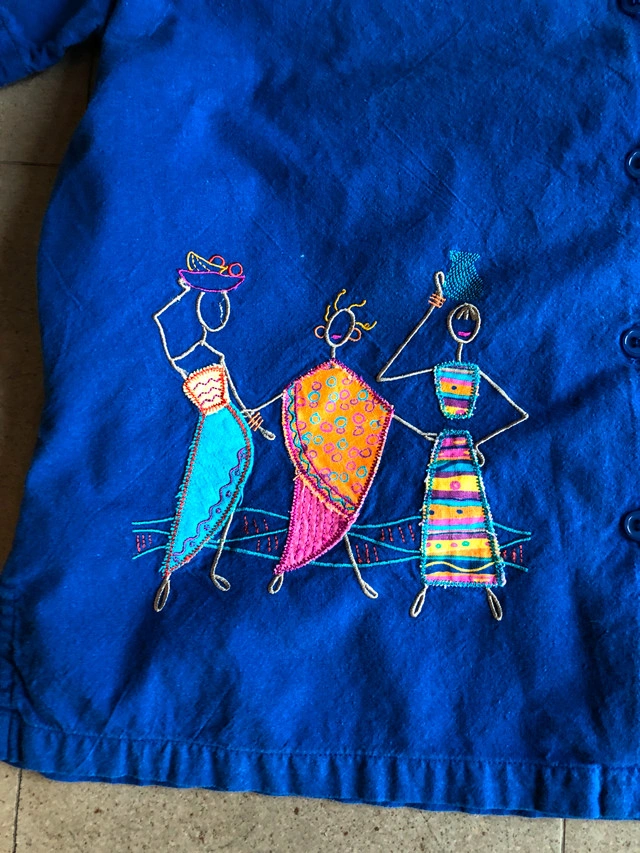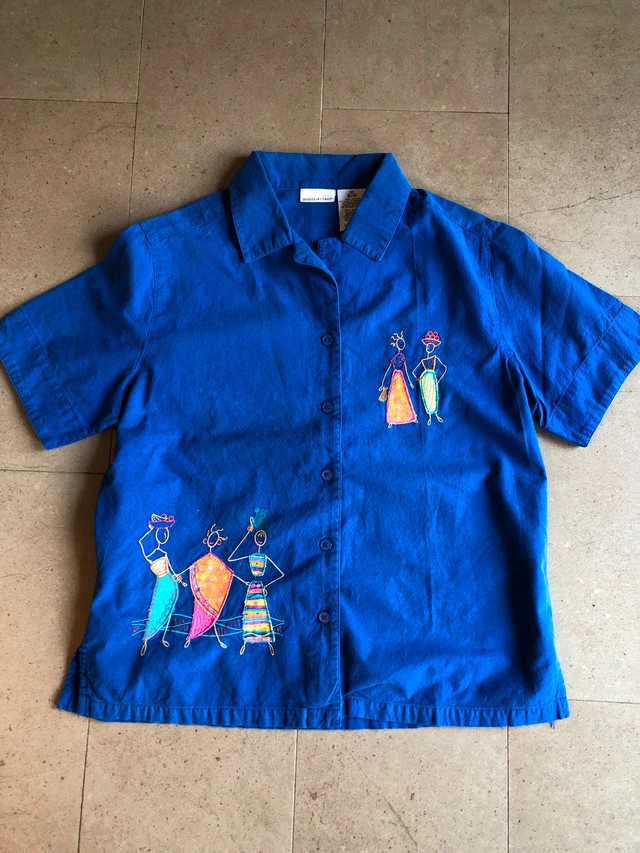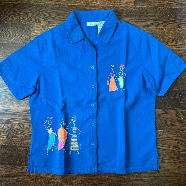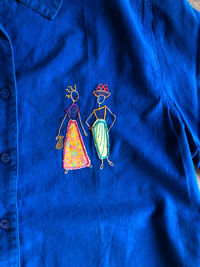 Selling cute unique Vintage blue cotton button down collar top with beautiful whimsical impressionistic African woman embroidered and sewn on. Size 8/10 - Medium. 100% cotton. Great vintage condition. Measurements lying flat: Pit to pit: 20.5" Length: 24" Asking $25. Available for pick up in the Broadview/Danforth area. Contact-free porch pick up. Check out my other great stuff!