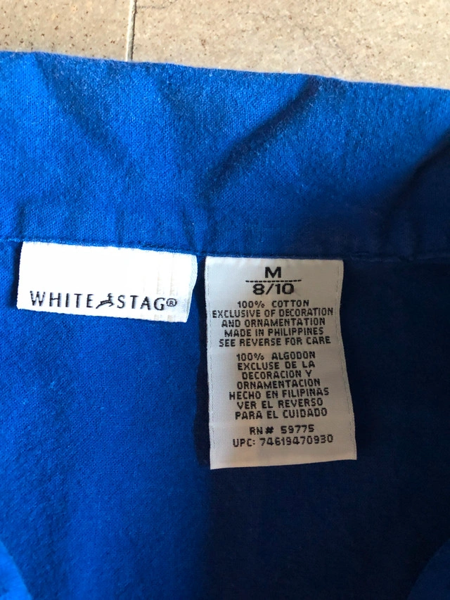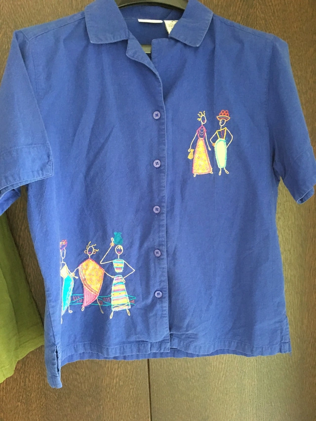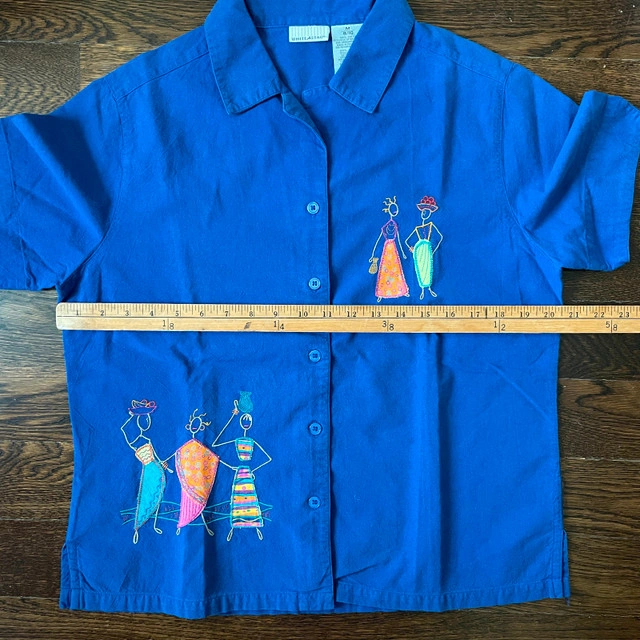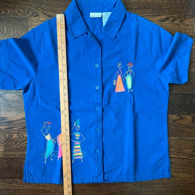 Selling cute unique Vintage blue cotton button down collar top with beautiful whimsical impressionistic African woman embroidered and sewn on. Size 8/10 - Medium. 100% cotton. Great vintage condition. Measurements lying flat: Pit to pit: 20.5" Length: 24" Asking $25. Available for pick up in the Broadview/Danforth area. Contact-free porch pick up. Check out my other great stuff!