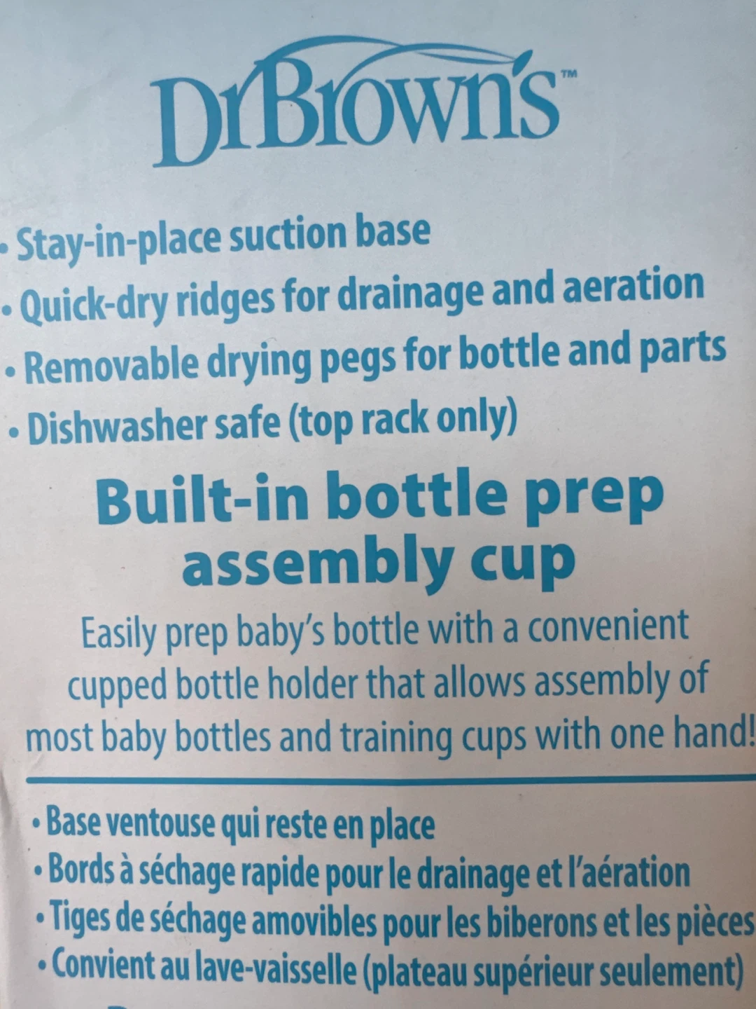 This Dr. Brown's silicone mat is designed for drying baby bottles and parts. It features quick-dry ridges for drainage and removable pegs for bottle and parts. It also has a built-in bottle prep assembly cup for easy bottle building.