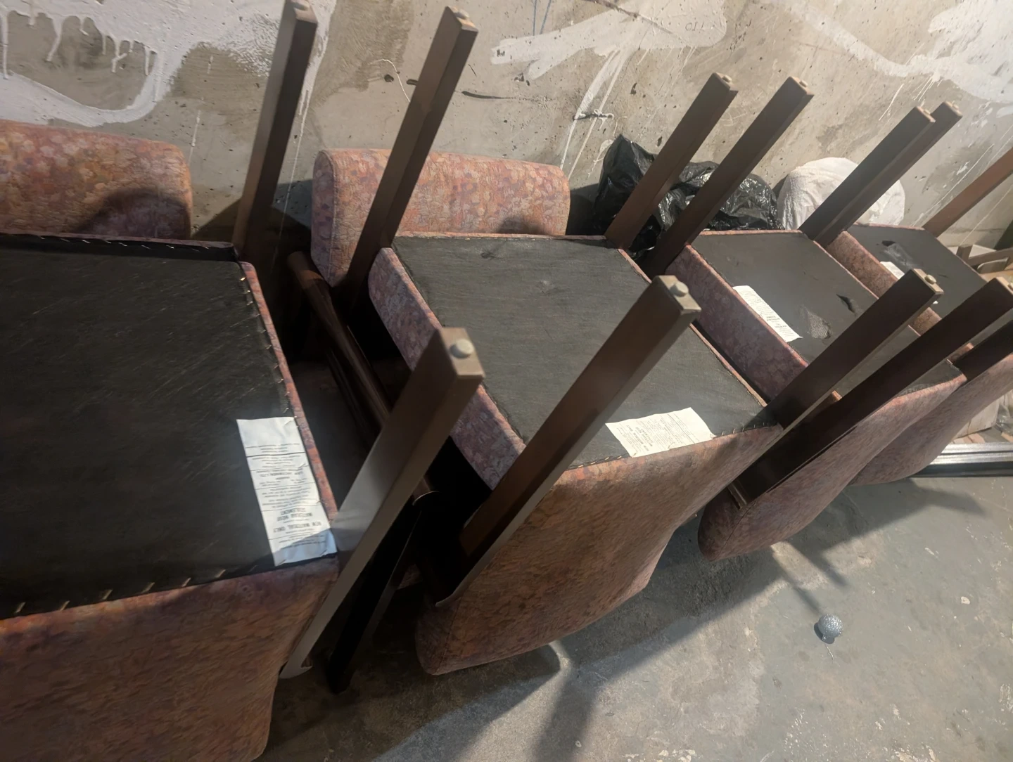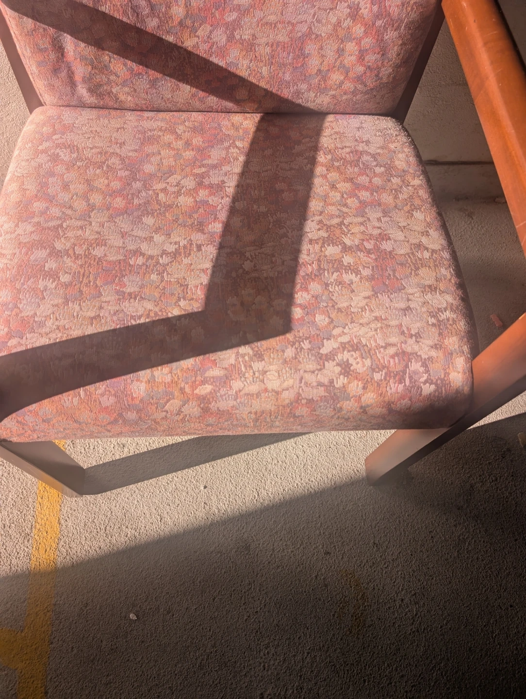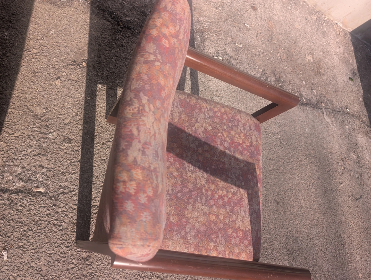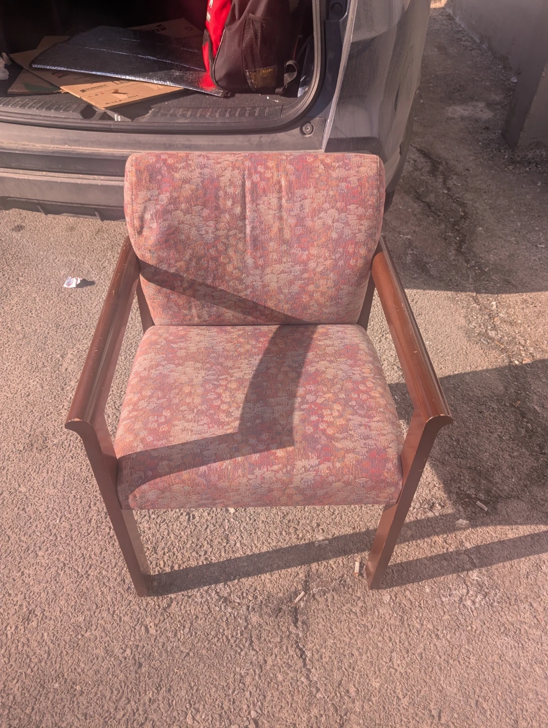 This armchair has a patterned fabric upholstery in shades of pink and orange. It features a wooden frame and armrests. This chair would be great for a waiting room or office space.