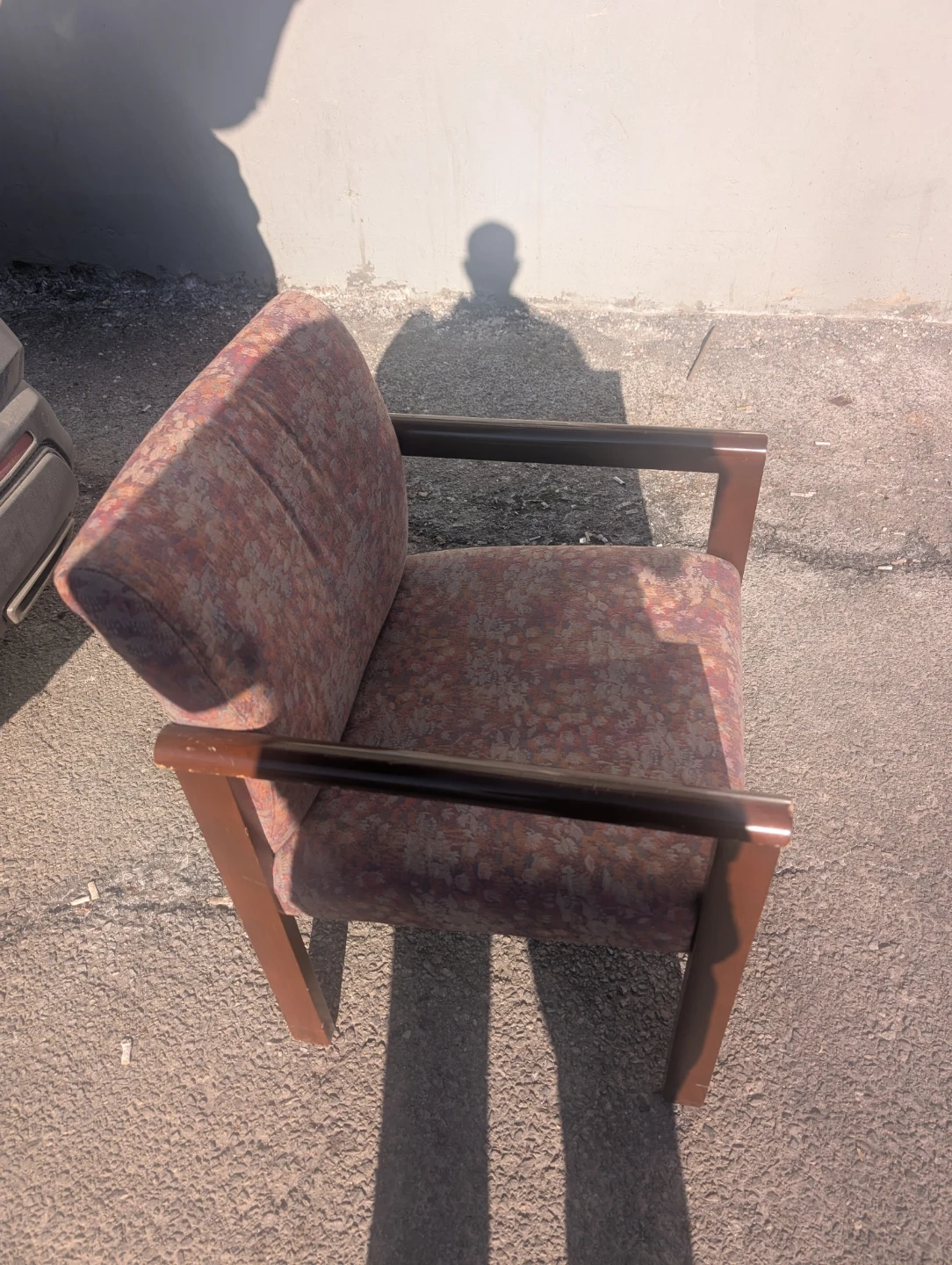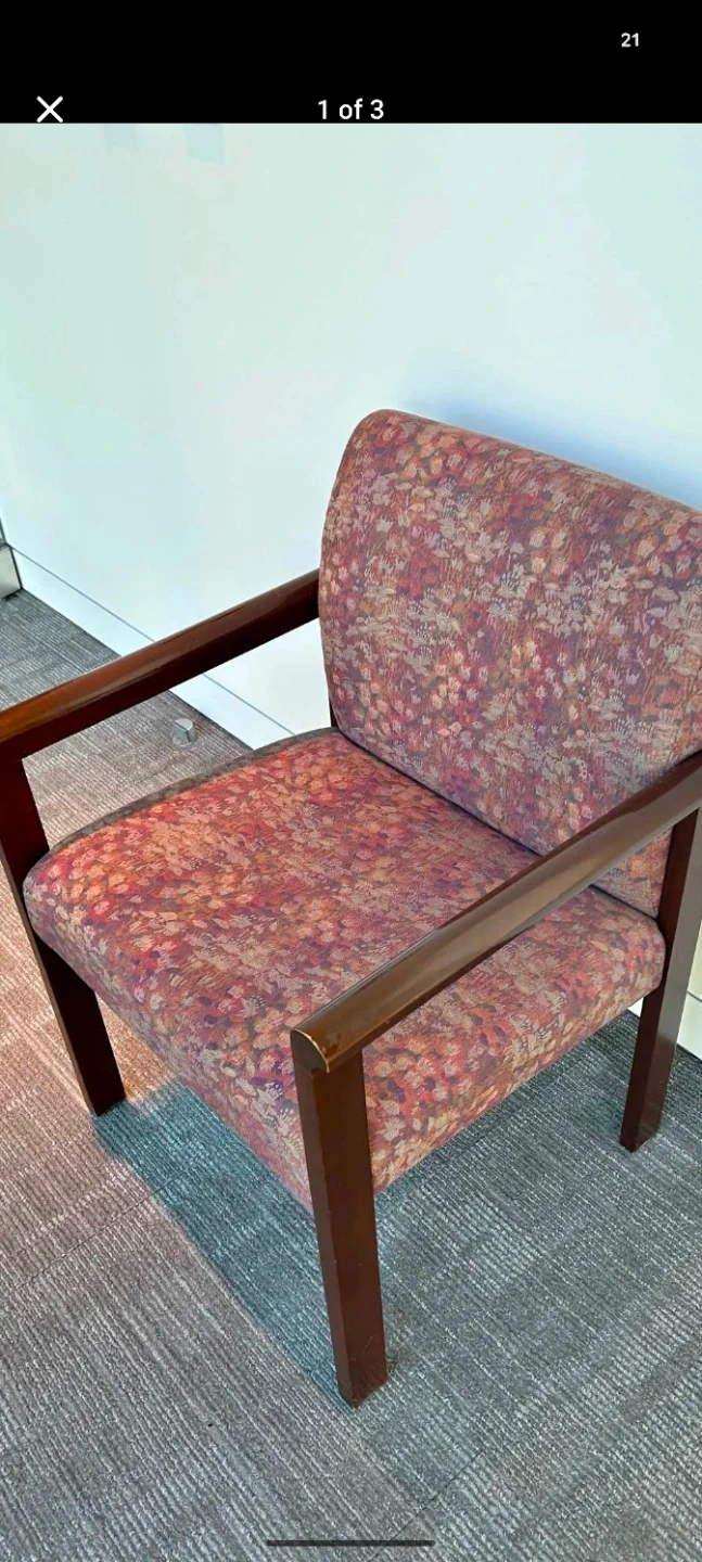 This armchair has a patterned fabric upholstery in shades of pink and orange. It features a wooden frame and armrests. This chair would be great for a waiting room or office space.