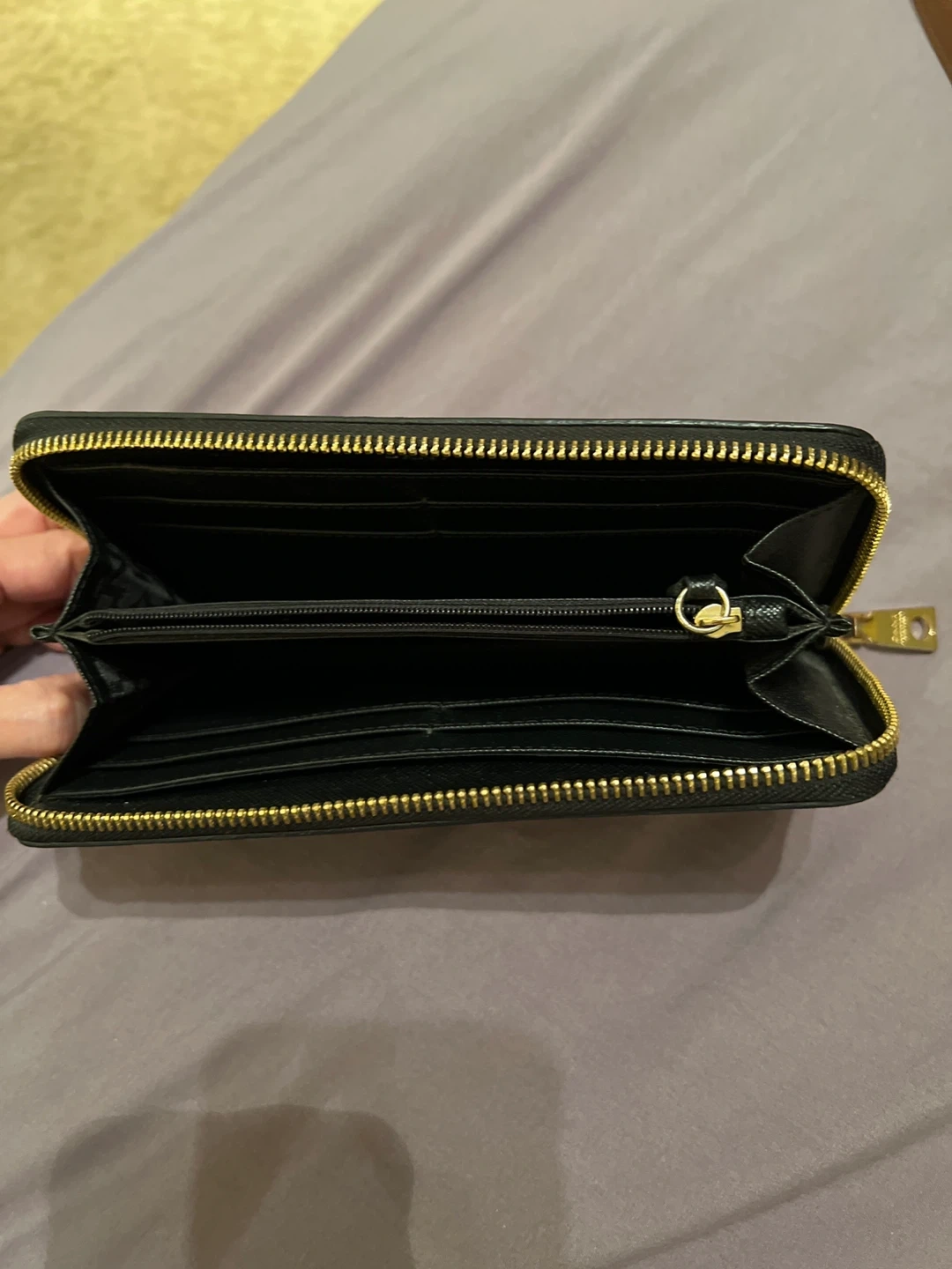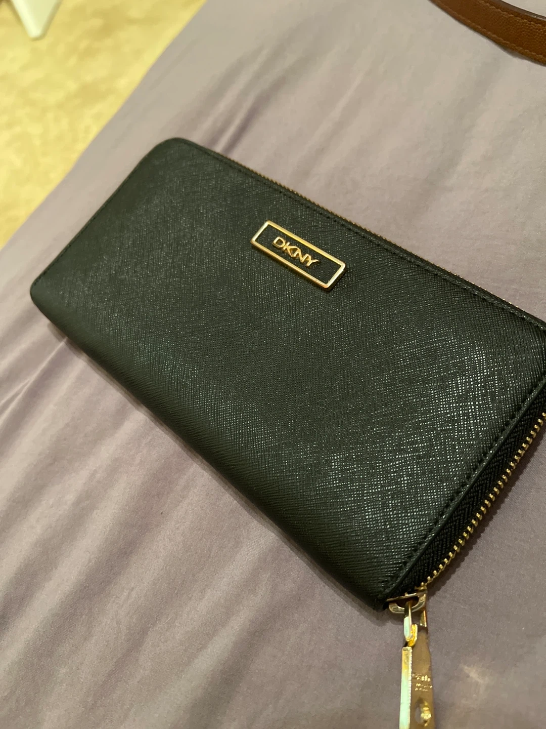 This is a DKNY zip-around wallet in black. It features a textured exterior and gold-tone hardware. Plenty of card slots and compartments inside!