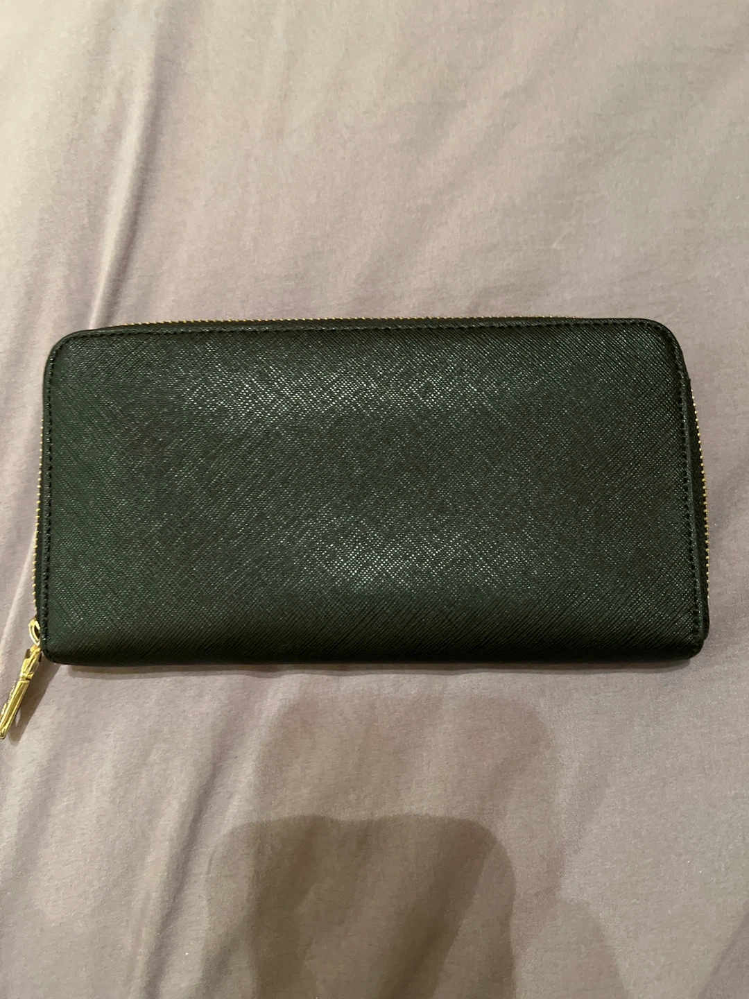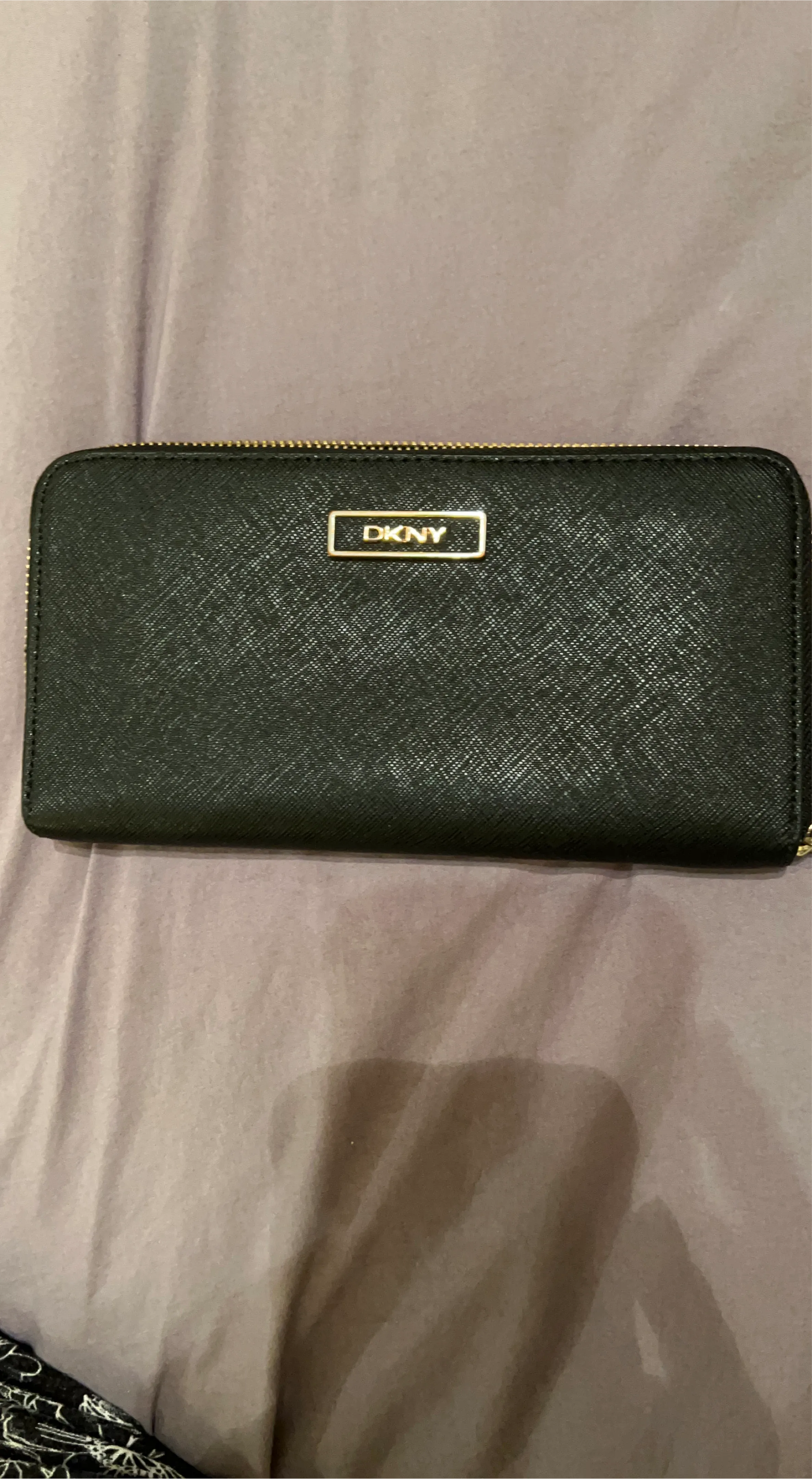 This is a DKNY zip-around wallet in black. It features a textured exterior and gold-tone hardware. Plenty of card slots and compartments inside!