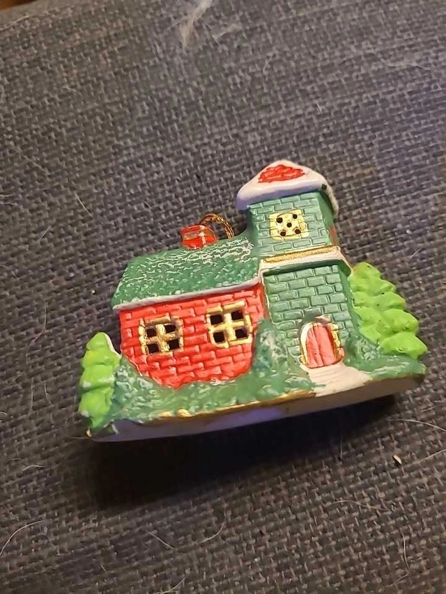 Add a touch of festive charm to your holiday decor with this delightful Christmas ornament! This ornament features a quaint little house nestled amongst evergreen trees, all rendered in vibrant, cheerful colours. Being a used item, it carries a unique character and a touch of nostalgia. While I can't pinpoint its exact age, it's in good shape and ready to spread some holiday cheer. Perfect for hanging on your Christmas tree or adding a whimsical touch to your holiday display. If this ad is still up, the ornament is still available.