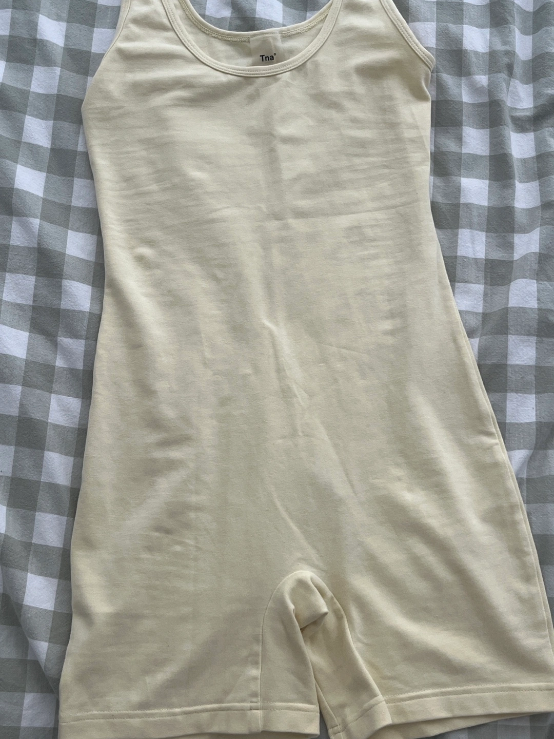 Selling a TNA romper in a cream colour. It's a size small and in great condition! Perfect for layering or wearing on its own during warmer weather. The material is soft and comfortable, making it a great addition to your wardrobe