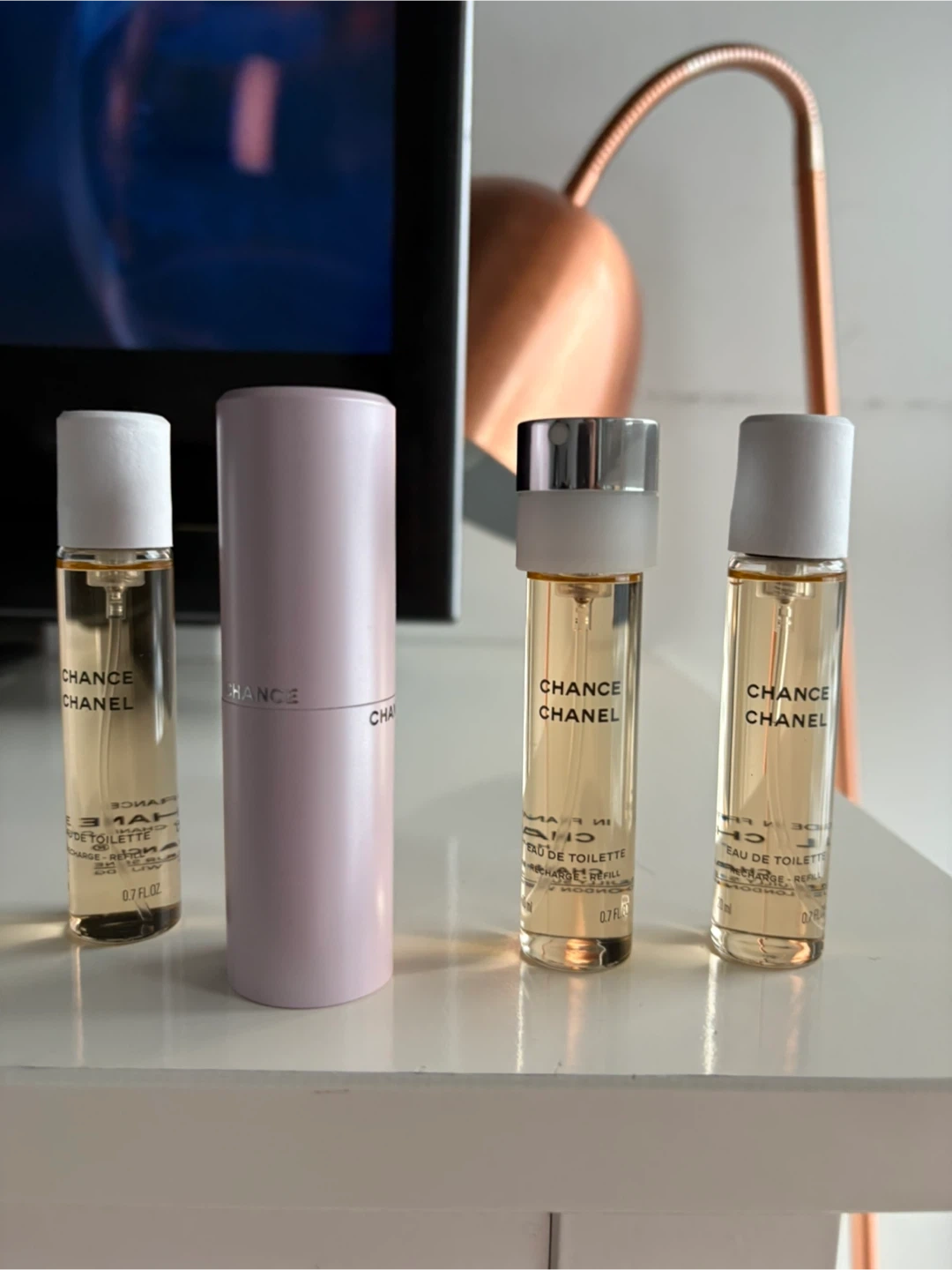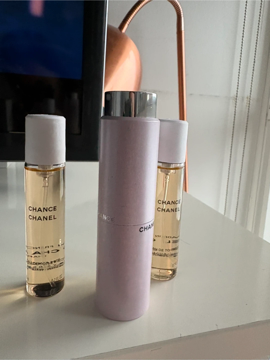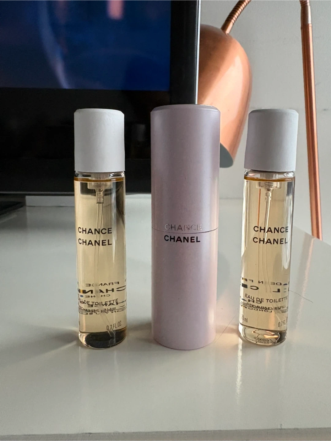 Selling a set of Chanel Chance Eau de Toilette refills! Each bottle contains 0.7 fl oz. The set includes the refillable case as well