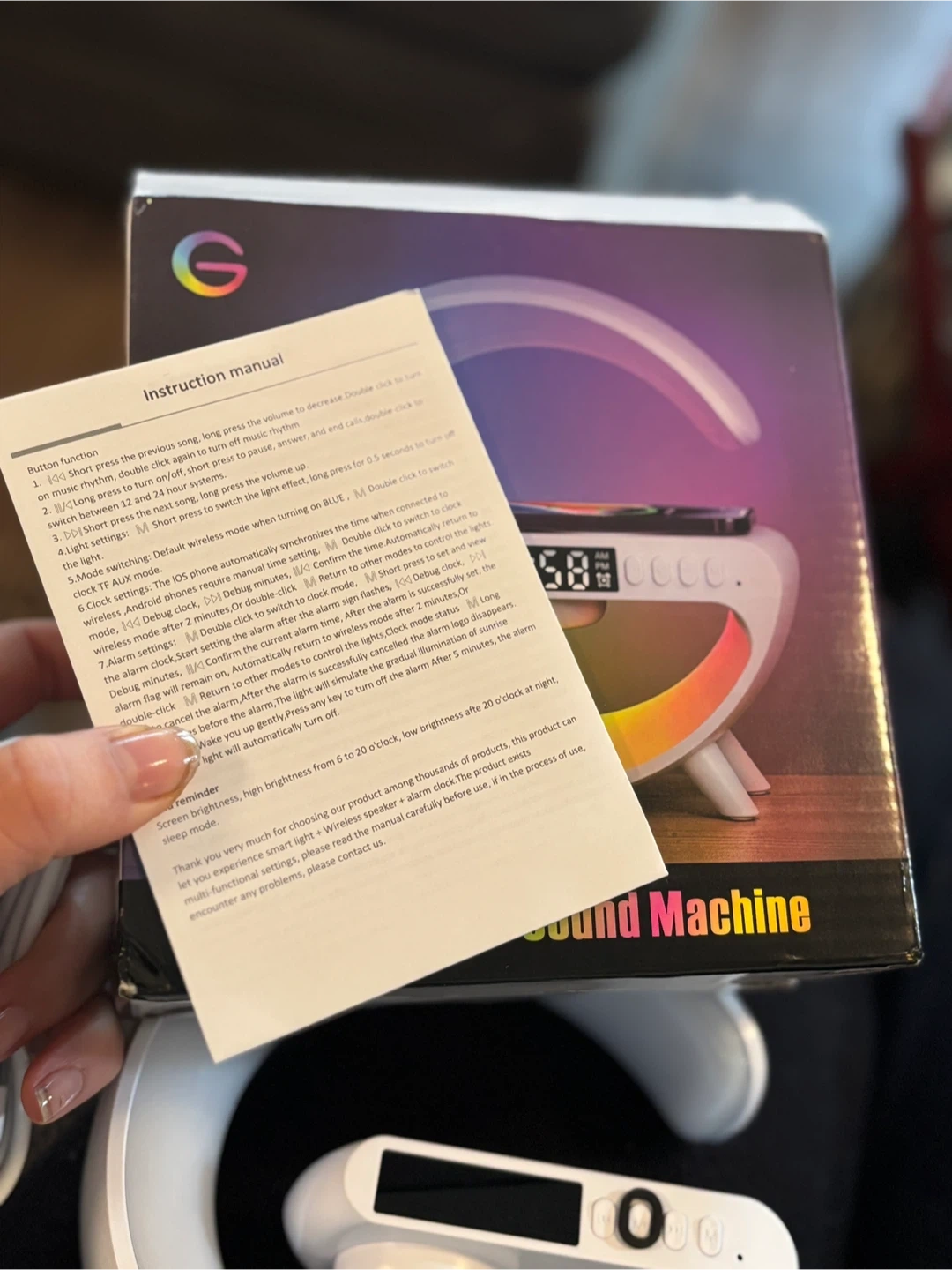 Great for winter mornings — sunrise light helps you wake up gently. Brand new Smart Light Sound Machine with sunrise alarm clock, sleep sounds, and wireless phone charging. Great for improving sleep and waking up naturally with gradual light instead of a loud alarm. Features: • 🌅 Sunrise simulation wake-up light • 🔊 Natural sleep sound machine • 📱 Wireless phone charging • ⏰ Digital alarm clock • 🌈 16 million colour light modes • 💡 Dimmable night light • 😴 Natural sleep aid mode Perfect for: • Bedside table • Kids rooms • Light sleepers • Creating a relaxing nighttime routine Includes: • Light sound machine • USB charging cable • Instruction manual • Original box Condition: Brand new in box (only opened to photograph) alarm clock sunrise alarm wake up light sound machine sleep machine bedside light wireless charger smart lamp night light kids night light sleep aid bedroom light